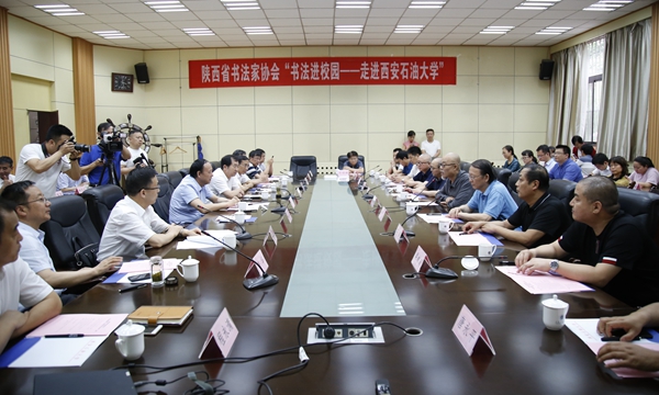 6月28日下午,陜西省書法家協會“書法進校園——走進西安石油大學”活動在雁塔校區會議中心第一會議室舉辦。中國書法家協會理事、陜西省書法家協會主席陳建貢一行13人來我校與師生進行了交流座談。我校校領導,相關部門和學院負責人,校書法協會教師代表、學生代表以及多家媒體記者參加了活動。