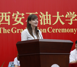 化學化工學院環境1502班彭蓉同學和儲運1503班哈薩克斯坦籍熱妮婭同學分別代表全體畢業生和留學生發言。畢業生代表向學校“寸心基金”捐款4348元。
