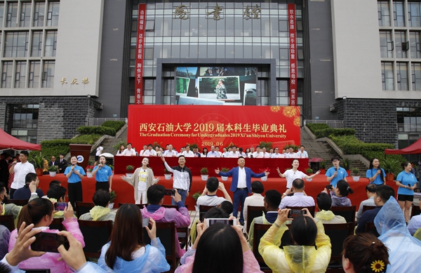 2019屆本科生畢業典禮在音樂系師生的“快閃”表演中拉開帷幕。音樂系師生在現場演唱了《老師我想你》《我為祖國獻石油》《我和我的祖國》三首歌曲,既表達了對恩師栽培的感恩之情,又體現了我校的石油石化特色,還蘊含了慶祝新中國成立70周年的意義。