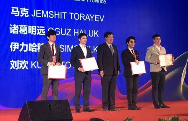 此次交流會上,我校土庫曼斯坦留學生馬克獲“一帶一路”教育傳播大使獎,省教育廳廳長王建利為他頒發證書。