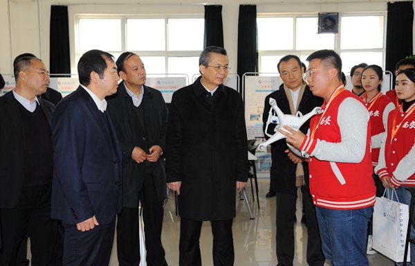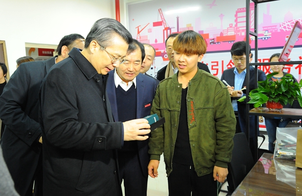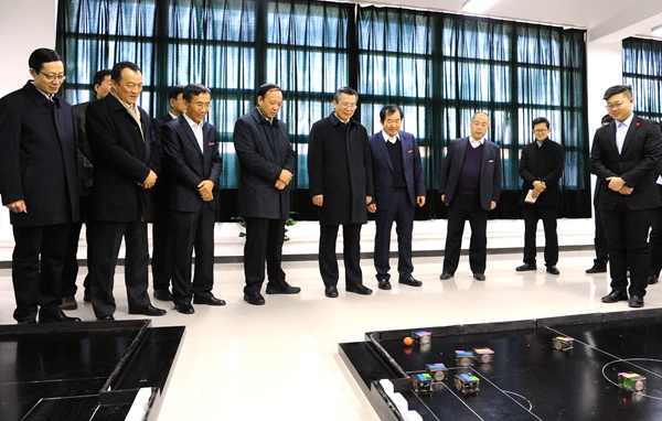 王永康首先來到我校工程訓練中心,先后參觀了石油科技創新成果館、足球機器人創新實踐基地、機械創新創業基地、大學生文化創新創業工坊、眾創加油站等,認真聽取了我校創新創業成果和作品介紹,詳細了解學校科技成果轉化、創新創業情況,他對我校創新創業成果表示肯定,稱贊學校創新創業的氛圍濃、創新創業的成果多、創新創業人才多,在科研、創新、創業等方面很有特色,做得很好;并與現場師生親切交流,鼓勵大家繼續努力,把創新創業做得更好。