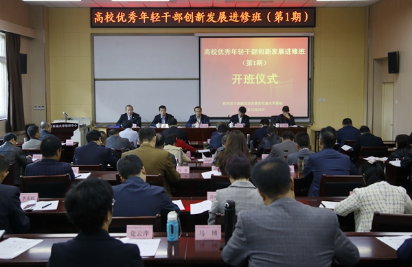 10月29日上午,陜西省高校優秀年輕干部創新發展進修班在我校明德校區順利開班。省干教辦副主任郭文超、我校副校長楊戰社、省委組織部干部教育處處長馬亮及省委高教工委組織部副部長王亞新出席開班式。陜西省干部教育培訓基地辦公室主任、繼續教育學院院長郭崗彥主持開班式。來自省屬高校的50名優秀年輕干部參加開班式。