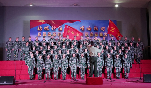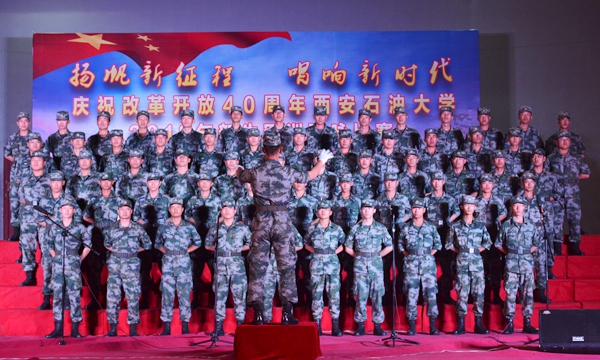 9月17日晚,我校“揚帆新征程,唱響新時代——慶祝改革開放40周年西安石油大學2018級新生軍訓歌詠比賽”在鄠邑校區西田徑場舉行。軍訓領導小組組長、校黨委副書記張木,軍訓旅司令部參謀長劉廣出席活動。學生工作處、保衛處、校團委、教務處、鄠邑校區管理辦公室等相關部門負責人擔任評委,各院(系)軍訓工作負責人及2018級全體新生一同觀看了比賽。