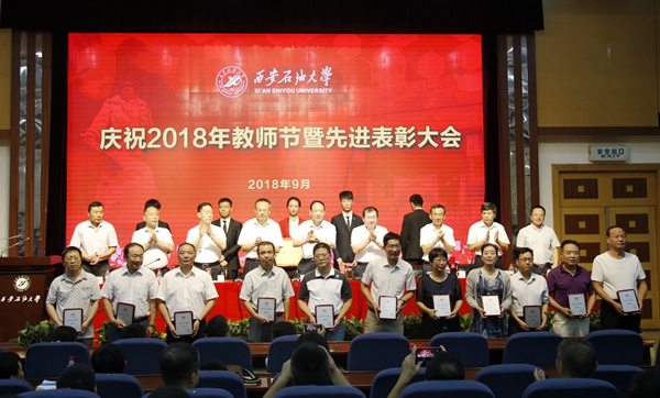 會上,校黨委書記賽云秀宣讀了《西安石油大學關于表彰獎勵“教書育人30年”教師的決定》和榮獲2018年陜西省師德建設先進集體和師德先進個人名單;紀委書記李延平宣讀了榮獲2017年省部級科技成果獎勵項目名單和2018年“陜西省教學名師”教師名單;校黨委副書記張木宣讀了榮獲2017年陜西省高等教育教學成果獎獲獎名單和2017年中國石油教育學會高等教育教學成果獎獲獎名單;校黨委副書記雷西合宣讀了《中共陜西省委高教工委關于表彰全省高校先進基層黨組織、優秀共產黨員和優秀黨務工作者的決定》;副校長楊戰社宣讀榮獲2017年陜西省“特支計劃”教師名單;副校長陳軍斌宣讀了榮獲2017年“全國高校思想政治理論課教學骨干”稱號教師名單、陜西高等學校第四屆青年教師教學競賽獲獎名單和《中共西安石油大學委員會關于表彰先進黨組織、優秀黨務工作者、優秀黨支部書記和優秀共產黨員的決定》;副校長李華宣讀了《中共西安石油大學委員會、西安石油大學關于表彰2018年優秀教師、先進教育工作者的決定》和《中共西安石油大學委員會、西安石油大學關于表彰2018年師德建設先進集體和師德先進個人的決定》;“弘石”基金委員會副理事長何力宣讀了2017年度“弘石基金獎”獲獎教師名單。校領導為受表彰的先進集體和個人頒獎。