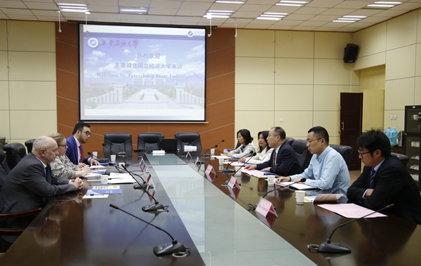陳軍斌副校長對圣彼得堡國立經濟大學代表團來訪表示歡迎,隨后從歷史沿革、師生規模、科研特色、專業設置、校企合作、國際交流等方面對我校進行了介紹。他表示,當天上午在2018絲綢之路教育合作交流會上簽署的合作協議是兩校合作的良好開端,希望接下來尋找兩校進一步合作的契合點,開展校際合作交流和學生互換項目。