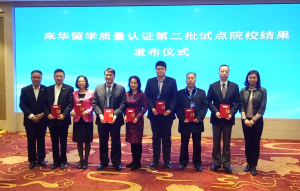 12月15日下午,中國高等教育國際化發展狀況調查報告發布暨來華留學質量認證工作會在北京召開,并舉行了來華留學質量認證第二批試點院校結果發布儀式。中國教育國際交流協會秘書長趙靈山、教育部國際司人文交流機制辦處長毛東敏等出席會議并講話,并為通過認證院校頒發證書。我校與浙江大學、西北工業大學等35所院校順利通過認證,副校長陳軍斌代表學校接受質量認證證書。