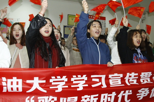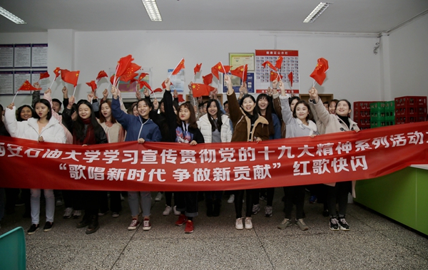 “紅歌快閃”活動僅僅是西安石油大學學習宣傳貫徹黨的十九大精神的系列活動之一。學校將學習宣傳貫徹黨的十九大精神作為當前和今后一個時期的首要政治任務,通過中心組學習、專家報告會、組織生活會、青年教師座談會、學生黨員座談會等形式,通過報紙、廣播、電視、網絡、微信、櫥窗等多種媒體,注重網上網下全覆蓋,積極創新形式,緊貼青年學生實際,運用H5、圖解圖說、網絡直播等接地氣、形象化、通俗化的方式,注重在春風化雨、潤物無聲中宣傳黨的十九大精神,不斷提高學習宣傳教育的親和力和實效性。