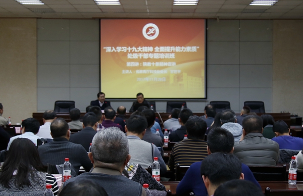11月28日下午,我校“深入學習黨的十九大精神,全面提升能力素質”處級干部專題培訓班第四講在雁塔校區會議中心第三會議室舉辦。省教育廳科技處處長甘世平應邀來校作報告,副校長李天太主持報告會,全校處級干部參加報告會。