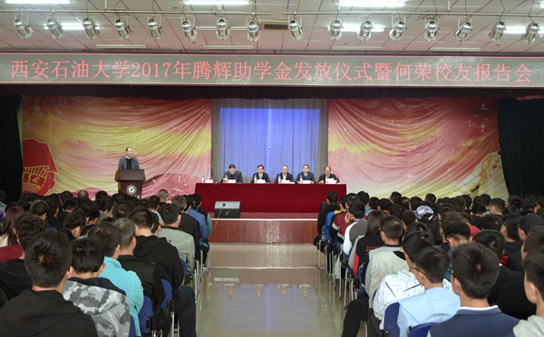 11月10日下午,我校2017年騰輝助學金發放儀式暨何榮校友報告會在鄠邑校區騰輝大學生活動中心舉行。校黨委副書記張木,我校校友、西安騰輝電器有限公司總經理何榮出席活動。學生工作處、合作發展處、機械工程學院負責人,騰輝公司10余名員工及600余名學生參加了活動。