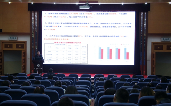 報告中,羅教授從國內石油的開采現狀出發,指出目前國內主要中高滲水驅油田已經進入“二三結合”的開發階段,現有化學驅采油技術在提高采收率與環境污染方面面臨諸多技術挑戰,內源微生物采油技術是油田提高采收率的主要發展方向,具有諸多技術優勢,建議我校科研人員集中力量提早關注并開展技術攻關。隨后他還介紹了低滲、特低滲透水驅開發油田主體技術進展,以及稠油、致密油等非常規油氣的開采現狀。羅教授的整場報告內容豐富,數據詳實,深受與會師生的一致好評。