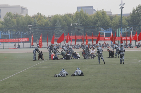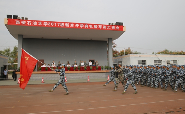 開學典禮暨軍訓匯報會在激昂的國歌聲中拉開了序幕。伴隨著嘹亮的口號,2017級新生們在各院(系)輔導員的帶領下邁著整齊矯健的步伐,精神飽滿地經過主席臺,接受校領導的檢閱。隨后,新生們還進行了擒敵拳方陣、武警舞步操方陣、匕首操方陣、舞旗擒敵配套方陣、戰術解救人質演習、石油學子花樣隊形等科目的表演。