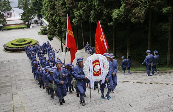 在井岡山烈士陵園,學員們走進青松環抱、鮮花盛開的紀念大廳,在毛澤東同志書寫的“死難烈士萬歲”的巨幅牌匾前,大家懷著崇敬的心情向長眠在此的英烈們敬獻了花圈。