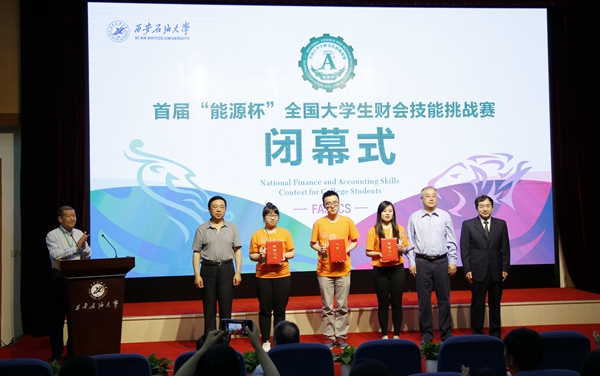 頒獎典禮上,中國高等教育學會高等財經教育分會副理事長兼秘書長張國才、中國石油企業協會副會長兼秘書長高潮洪、我校副校長李天太為特等獎獲得者頒獎。國家行政學院教務部主任丁文鋒、中國石油長慶油田分公司總會計師童天喜為一等獎獲得者頒獎。陜西延長石油(集團)有限責任公司總會計師康永智、陜西省國稅局科研所副所長劉峰為二等獎獲得者頒獎。廣州市福思特科技有限公司董事長閆曉霞、中國高等教育出版社經管分社社長劉清田為三等獎獲得者頒獎。大賽組委會主任、我校副校長陳軍斌為優秀組織獎獲得單位頒獎。北京中博誠通國際技術培訓有限責任公司西北地區經理曹遠攀、我校實驗室管理處處長孟開元為優秀指導教師頒獎。