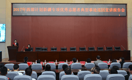 4月17日下午, 2017年西部計劃新疆專項優秀志愿者典型事跡巡回宣講報告會在新校區圖書館弘石學術報告廳舉辦。共青團陜西省委黨組成員、陜西省少先隊總輔導員、西部計劃陜西省項目辦主任趙大勝,校黨委副書記雷西合,共青團陜西省委志工部副部長陳曉華出席活動。西部計劃新疆專項優秀志愿者田宇、李蕊、席玉峰、吳旭東作了宣講報告。我校學生工作部、校團委負責人與四百余名師生聽取了報告。