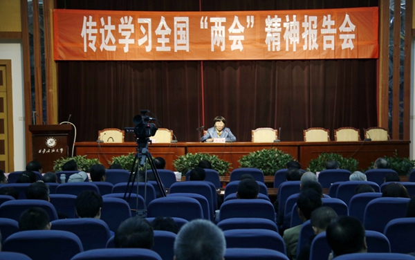 3月17日下午,校黨委中心組理論學習擴大會學習十二屆全國人大五次會議和全國政協十二屆五次會議精神。校領導和100余名處級干部參加了學習。全國人大代表、中科院院士、中科院地球環境研究所所長、陜西省政協副主席周衛健和全國政協委員、陜西東科制藥有限責任公司副董事長趙東科教授為大家傳達了全國“兩會”精神。