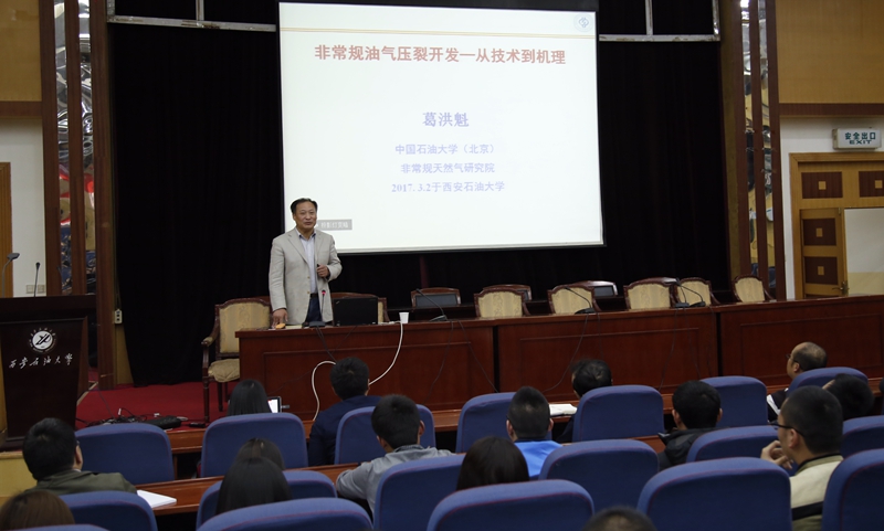 3月2日下午,中國石油大學(北京)二級教授葛洪魁在學術報告廳為我校師生作了題為《非常規油氣壓裂開發——從技術到機理》的學術報告。李天太副校長出席報告會。科技處負責人及300余名師生聽取了報告。