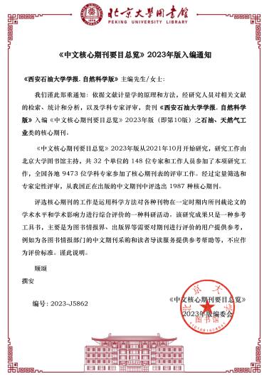 近日,接北京大學圖書館《中文核心期刊要目總覽》2023年版編委會通知,《西安石油大學學報(自然科學版)》入編《中文核心期刊要目總覽》2023年版(即第10版)之石油、天然氣工業類的核心期刊。這是本刊自2008年以來連續6次入選全國中文核心期刊。