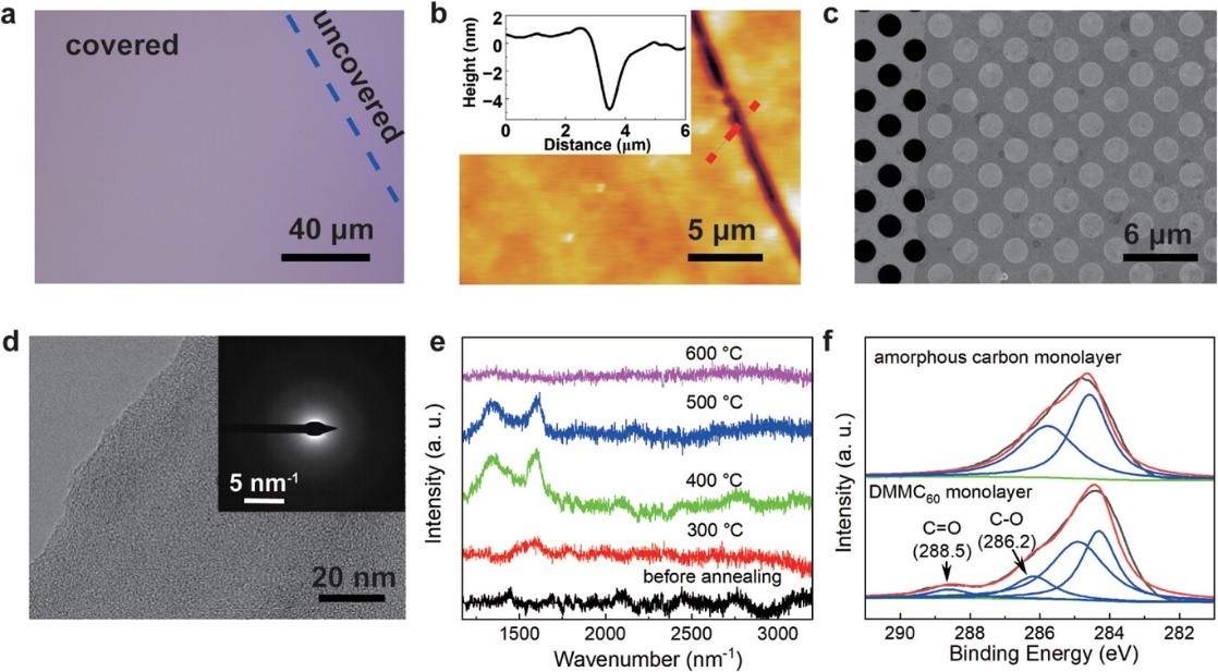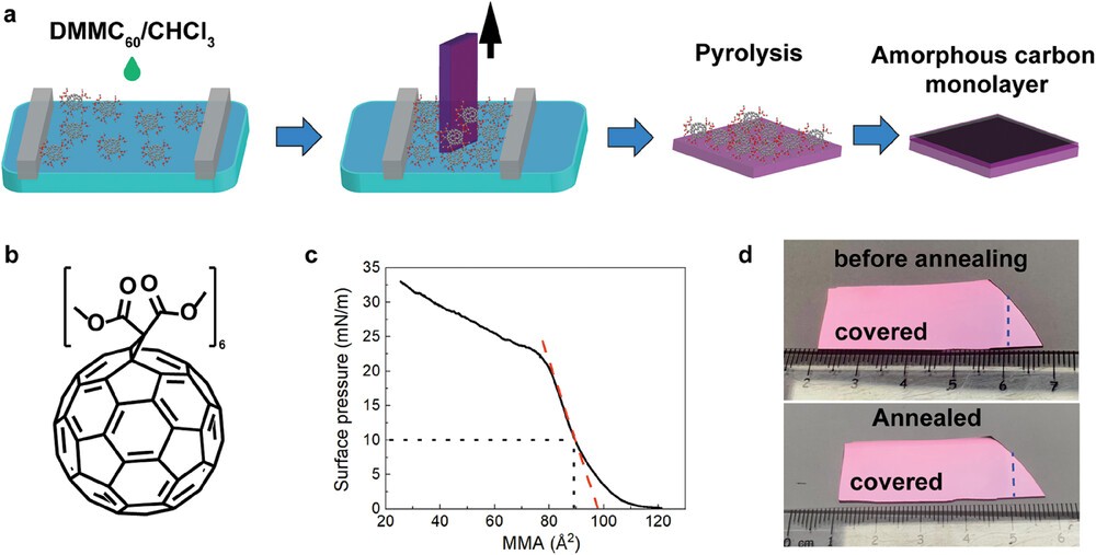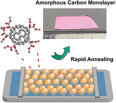 本研究中以改性的富勒烯單體為前驅體,通過Langmuir-Blodgett制膜-快速熱解兩步法制備了厘米尺寸的單層多孔非晶碳膜。研究證明其為亞穩態結構且不導電。此外,離子跨膜傳輸研究表明該膜具有陽離子選擇性(選擇性為26%)。這項工作對單層多孔非晶碳膜的可控制備具有指導意義。