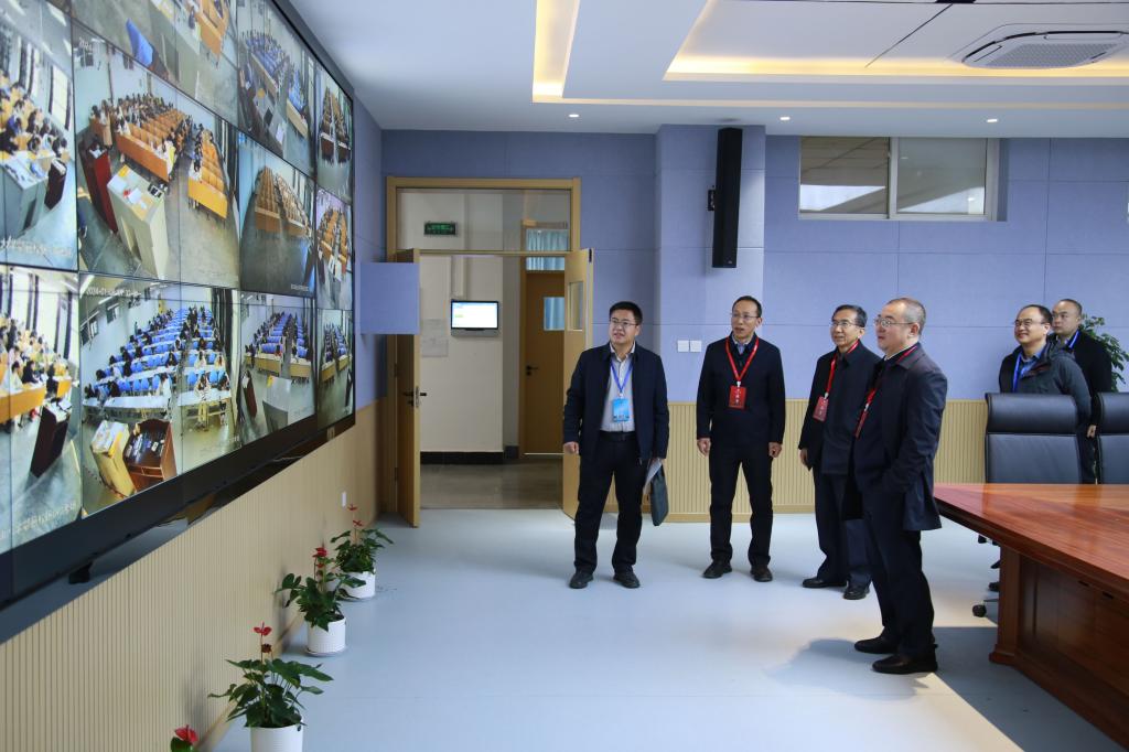 9日上午,校長王進富,副校長楊戰社、蘇文甫通過在博覽樓可視化中心查看各考場實時監控畫面,了解考試具體安排。在巡視考場期間,各考生全神貫注、認真答題,展現出了良好的考風。監考教師細致完成各項考務工作,嚴格監督考場紀律,體現出高度負責的工作作風。