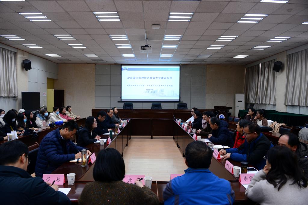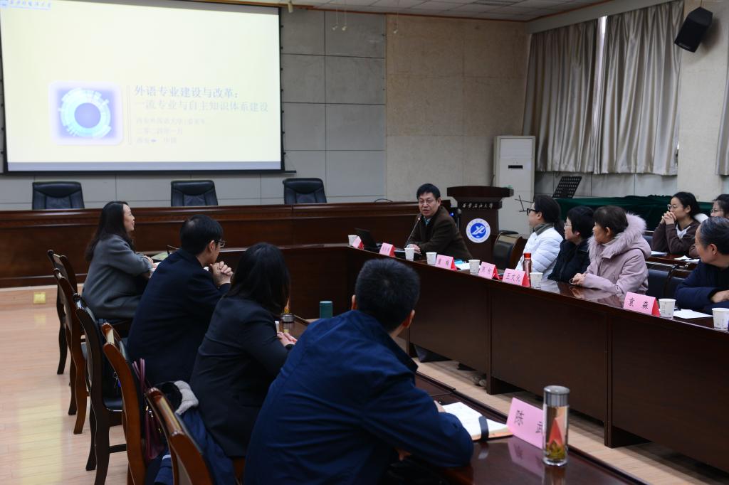 為迎接新一輪本科教育教學審核評估,做好迎評促建,扎實推進外語專業建設及英語國家級一流本科專業建設點驗收準備工作,我校邀請西安外國語大學副校長姜亞軍教授來校指導外語專業建設。1月16日下午,在雁塔校區會議中心第三會議室開展了題為“外語專業建設與改革:一流專業與自主知識體系建設”的報告會及交流座談。我校副校長蘇文甫、張君濤出席會議。外國語學院班子成員、各專業帶頭人及負責人、系部主任及所有任課教師參加了會議,會議由外國語學院副院長劉輝主持。
