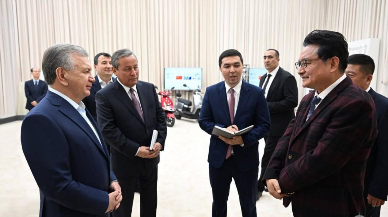 烏茲別克斯坦總統米爾濟約耶夫(左一)考察安集延州工業園區并接見赴安集延州商務考察團中方企業代表