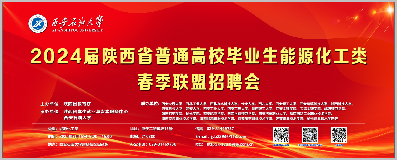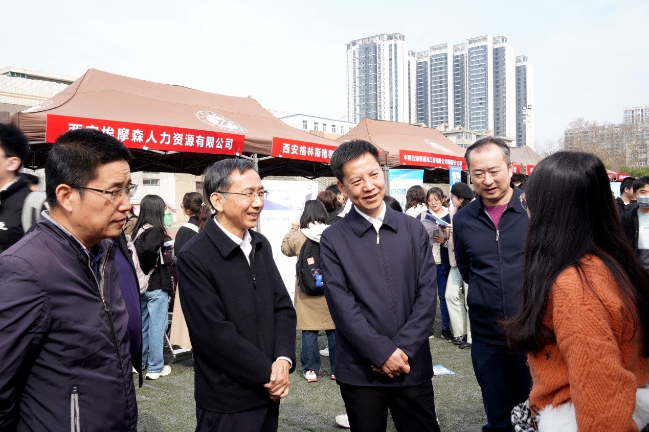 3月15日,由陜西省教育廳主辦,陜西省學生就業與留學服務中心和西安石油大學承辦的陜西省2024屆普通高校能源化工類畢業生春季聯盟招聘會在我校雁塔校區成功舉辦。省委教育工委委員、省教育廳副廳長申雪峰一行來校指導考察招聘工作。會前,申雪峰副廳長與我校黨委書記常江、黨委副書記張木就2024屆畢業生就業工作開展座談交流。陜西省學生就業與留學服務中心、省教育廳學生處有關負責同志陪同考察。