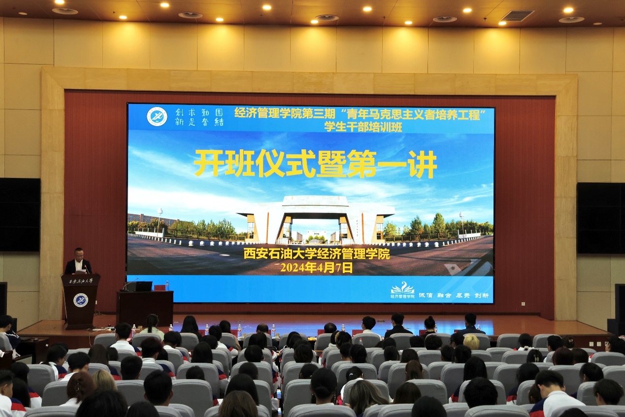 為深入學習貫徹習近平新時代中國特色社會主義思想和黨的二十大精神,提高青年學生的馬克思主義理論素養和實踐能力,引領廣大青年做有理想、敢擔當、能吃苦、肯奮斗的新時代好青年,4月7日晚,經濟管理學院第三期“青年馬克思主義者培養工程”學生干部培訓班開班儀式暨第一講在鄠邑校區弘石學術報告廳順利舉辦。校黨委副書記張木出席開班儀式并作專題輔導報告。經濟管理學院黨委書記談建勤,全體學生工作干部以及學生干部400余人參加培訓班開班儀式暨第一講。開班儀式由經濟管理學院黨委副書記王剛主持。