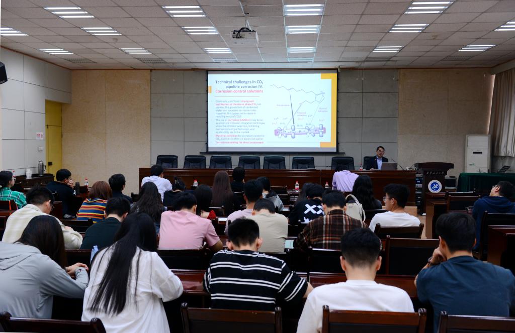 會見前,程玉峰院士在雁塔校區會議中心第三會議室,為相關專業師生作了“CCUS技術的二氧化碳管道發展及內腐蝕預測”的學術報告。程院士以“二氧化碳管道的全球分布”為切入點,概述了能源管道技術中的材料創新,包括氫氣脆化研究中的氣態氫-鐵原子相互作用,輸氫管道技術,CO2管道和儲罐超臨界條件,電化學腐蝕和應力腐蝕開裂(SCC),腐蝕管理中的機器學習方法,管道性能評估、故障和對環境的影響。他重點講述了CCUS技術、CCUS管道的發展、CO2管道的設計與技術挑戰及CO2管道的內部腐蝕。程院士提出了超臨界CO2腐蝕的新模型及CO2管道的五項技術,包括特定的工作壓力范圍和壓降,以避免不必要的相位變化;由含水量和其他雜質引起的腐蝕緩解和監測問題;具體的材料考慮,以盡量減少運行裂縫的風險;應急響應計劃和分散建模考慮;管道運行期間將采取的安全預防措施。