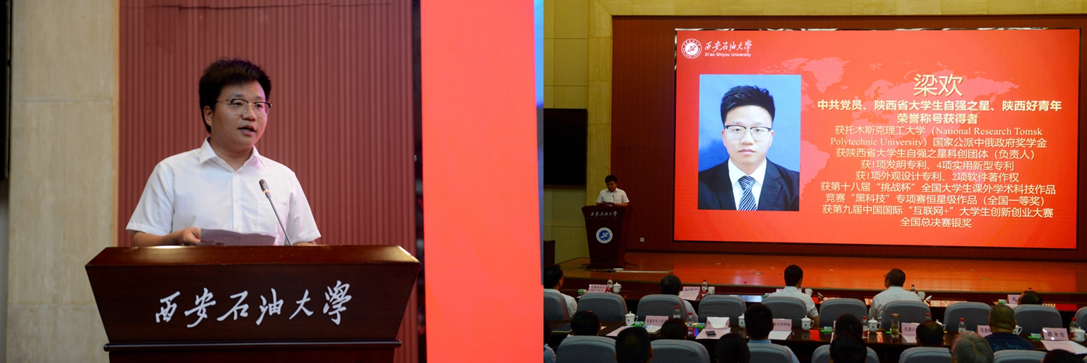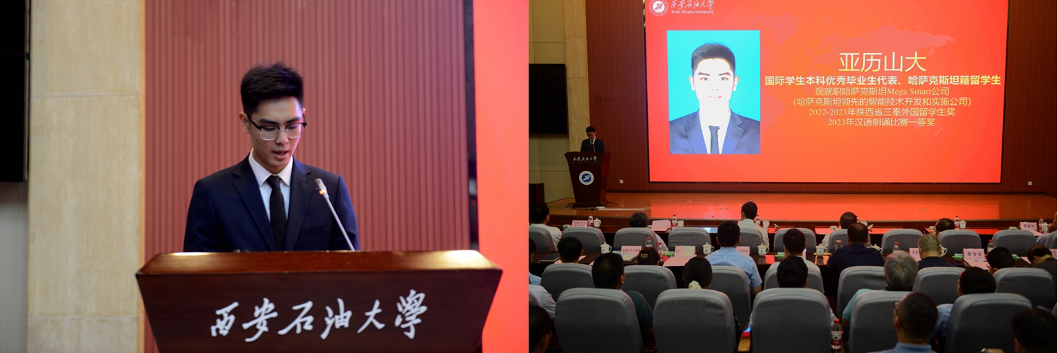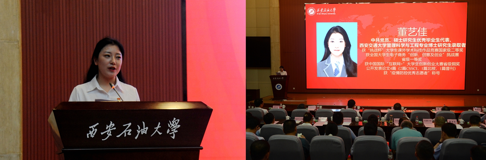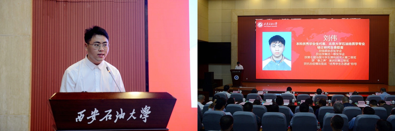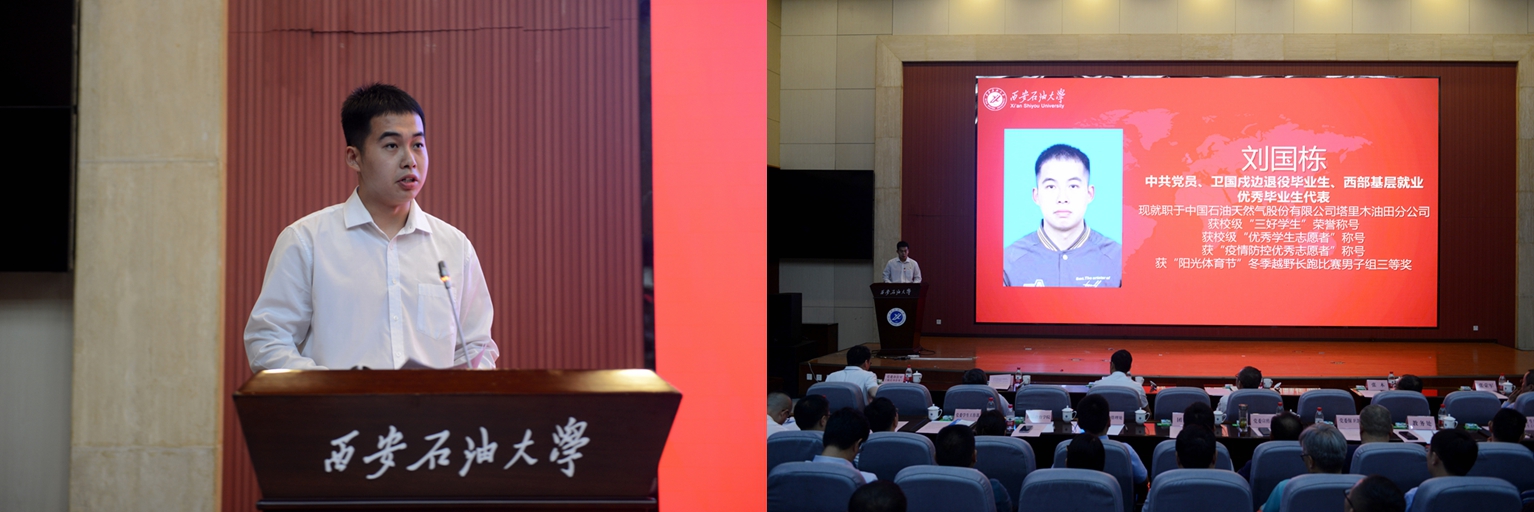 中共黨員、陜西省大學生自強之星、陜西好青年榮譽稱號獲得者,石油工程學院學生梁歡;本科優秀畢業生代表、北京大學石油地質學專業碩士研究生錄取者,地球科學與工程學院學生劉偉;國際學生本科優秀畢業生代表、哈薩克斯坦籍留學生,國際教育學院學生亞歷山大;中共黨員、碩士研究生優秀畢業生代表、西安交通大學管理科學與工程專業博士研究生錄取者,經濟管理學院學生董藝佳;中共黨員、衛國戍邊退役畢業生代表、西部基層就業優秀畢業生代表,石油工程學院學生劉國棟分別作了交流發言。