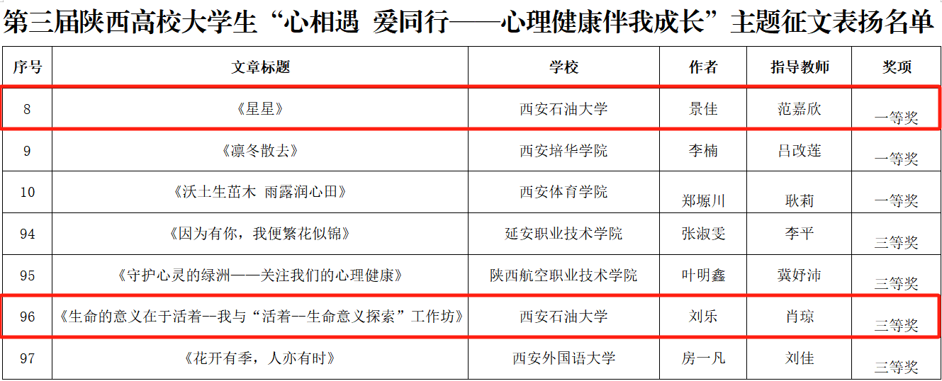 其中,在第九屆陜西高校心理健康教育指導典型案例比賽中,我校學生工作部(處)(學生心理成長指導中心)(以下簡稱“心理中心”)焦文潔、趙晶兩位老師分別榮獲一等獎和二等獎;在第三屆陜西高校學生心理健康教育課程教學展示活動中,心理中心魏曉言老師榮獲“教學骨干”稱號;在第三屆陜西高校大學生“心相遇愛同行——心理健康伴我成長”主題征文活動中,范嘉欣老師指導學生景佳的作品《星星》獲得一等獎,心理中心肖瓊老師指導學生劉樂的作品《生命的意義在于活著—我與“活著—生命意義探索”工作坊》獲三等獎。