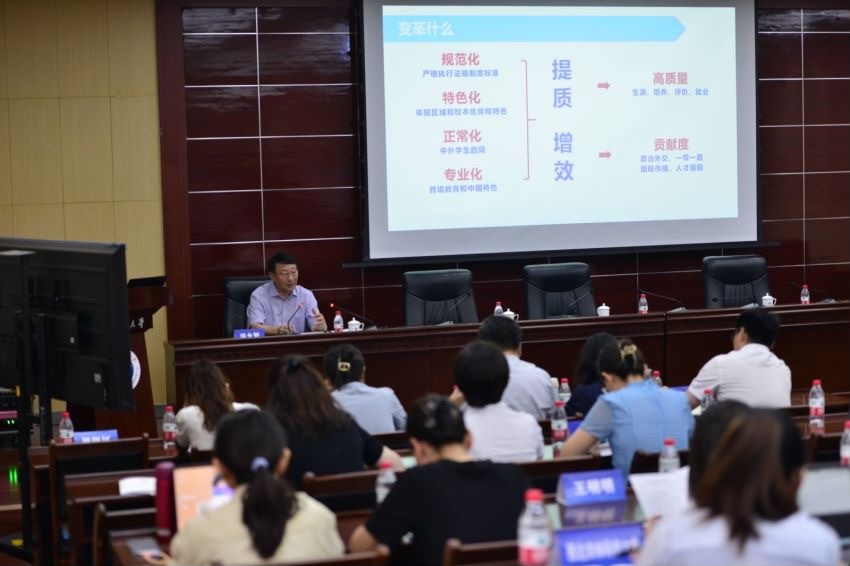 7月10日,由陜西省教育廳主辦,陜西省高等教育學會外國留學生教育管理分會、西安石油大學聯合承辦的陜西省高校來華留學質量認證培訓會在我校舉辦。中國教育國際交流協會副秘書長安延發來視頻致辭,中共陜西省委教育工委副書記王海波出席并講話,我校校長王進富致歡迎詞,副校長張榮軍主持培訓會第一環節。