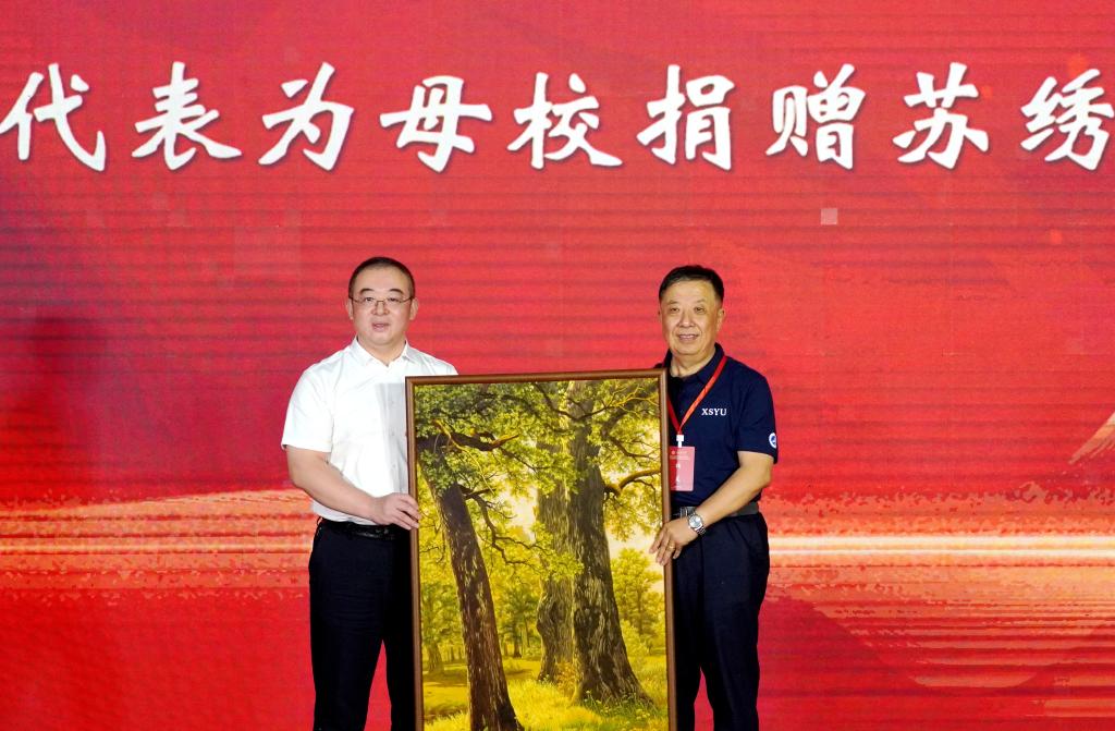 廠80級校友崔曉明為母校捐贈蘇繡《三棵樹》,表達對母校的祝福,常江代表學校接受捐贈,感謝80級校友對母校的深厚情誼。