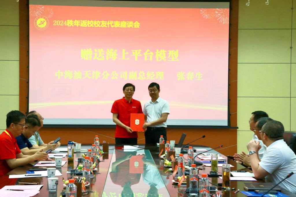 中海油天津分公司張春生校友向學校贈送了海上平臺模型,王進富代表學校接受捐贈并為張春生校友頒發了捐贈證書。