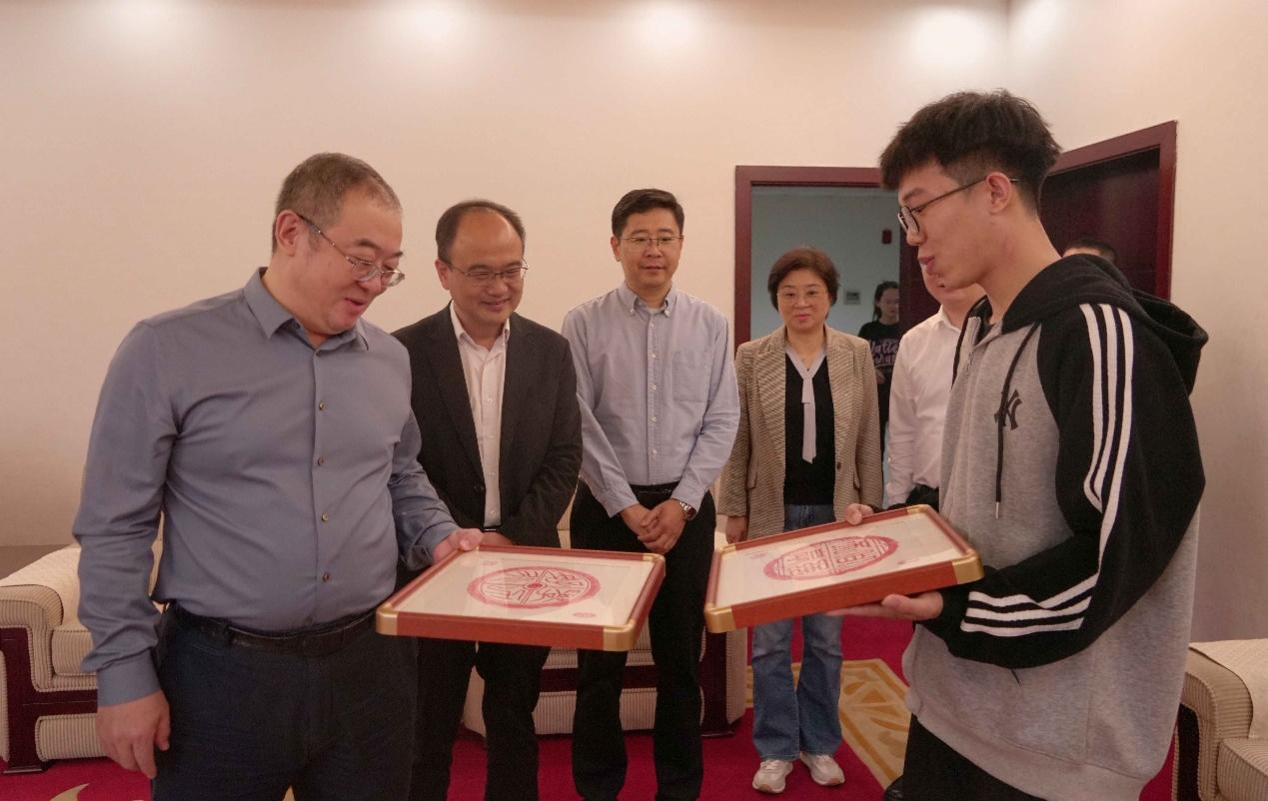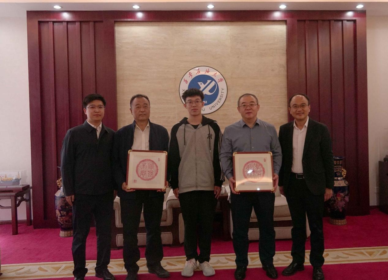 10月11日下午,學校建校73周年校慶日前夕,石油工程學院2023級學生、陜西省非物質文化遺產——長安瓦當制作技藝繼承人李瑞林同學向學校敬贈親手制作的印有“好學力行,自強不息”校訓的瓦當拓片。校黨委書記常江、校黨委副書記程永清、副校長趙健在鄠邑校區圖書館接待室接收贈禮,并與李瑞林同學親切交流。