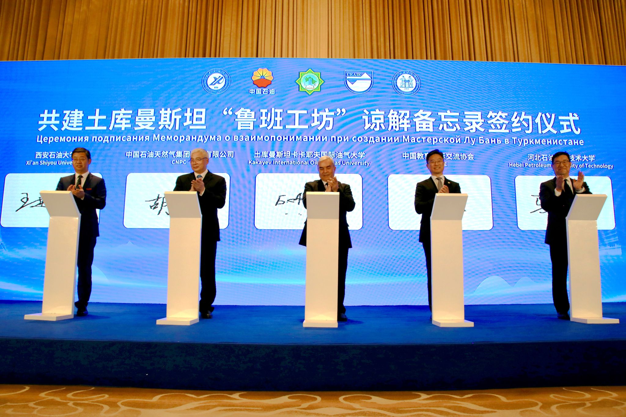 18日下午,共建土庫曼斯坦“魯班工坊”諒解備忘錄簽約儀式在陜西賓館成功舉行。土庫曼斯坦卡卡耶夫油氣大學校長拜拉姆穆拉特·阿塔馬諾夫、西安石油大學校長王進富、河北石油職業技術大學副校長馬顯才、中國教育國際交流協會秘書長楊軍、中國石油天然氣集團有限公司人力資源部副總經理胡紅民分別代表中土共建各方共同簽署《土庫曼斯坦魯班工坊諒解備忘錄》。