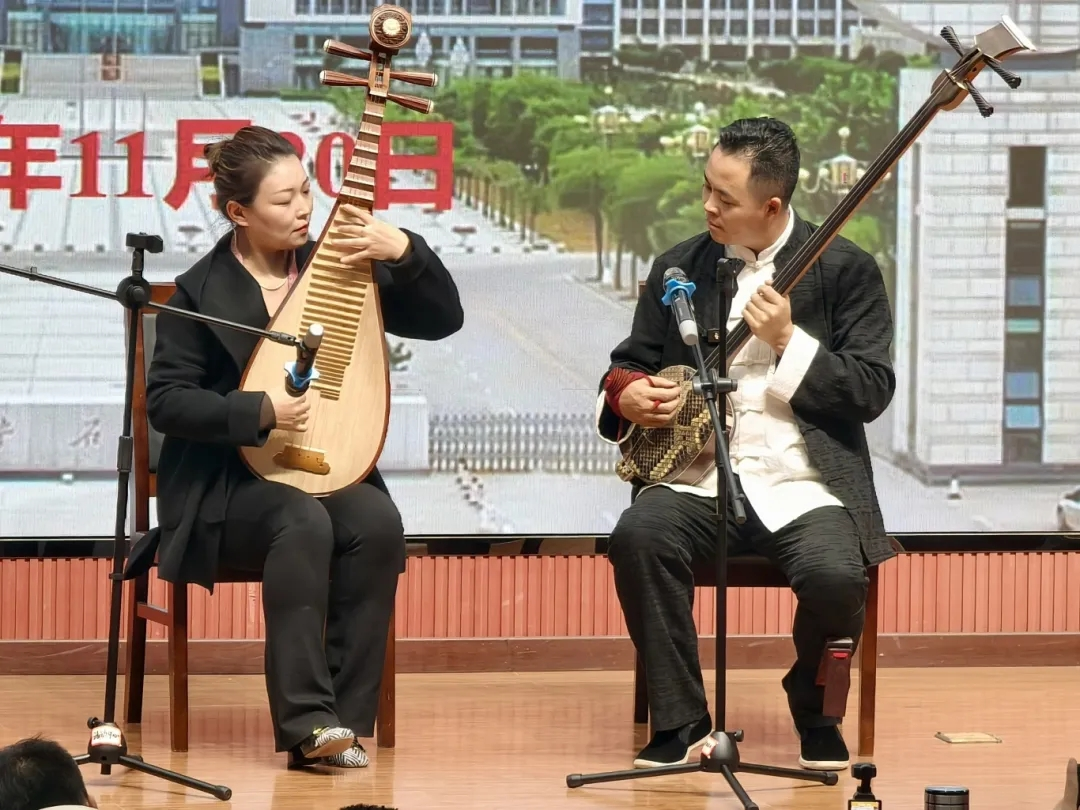 在報告環節,音樂系副主任張帆作為主講,從陜北說書的起源傳說、藝術特征、代表書匠、重要節點、機遇挑戰等五個方面作了專題背景介紹,并與熊竹英聯袂演奏了《南泥灣》。