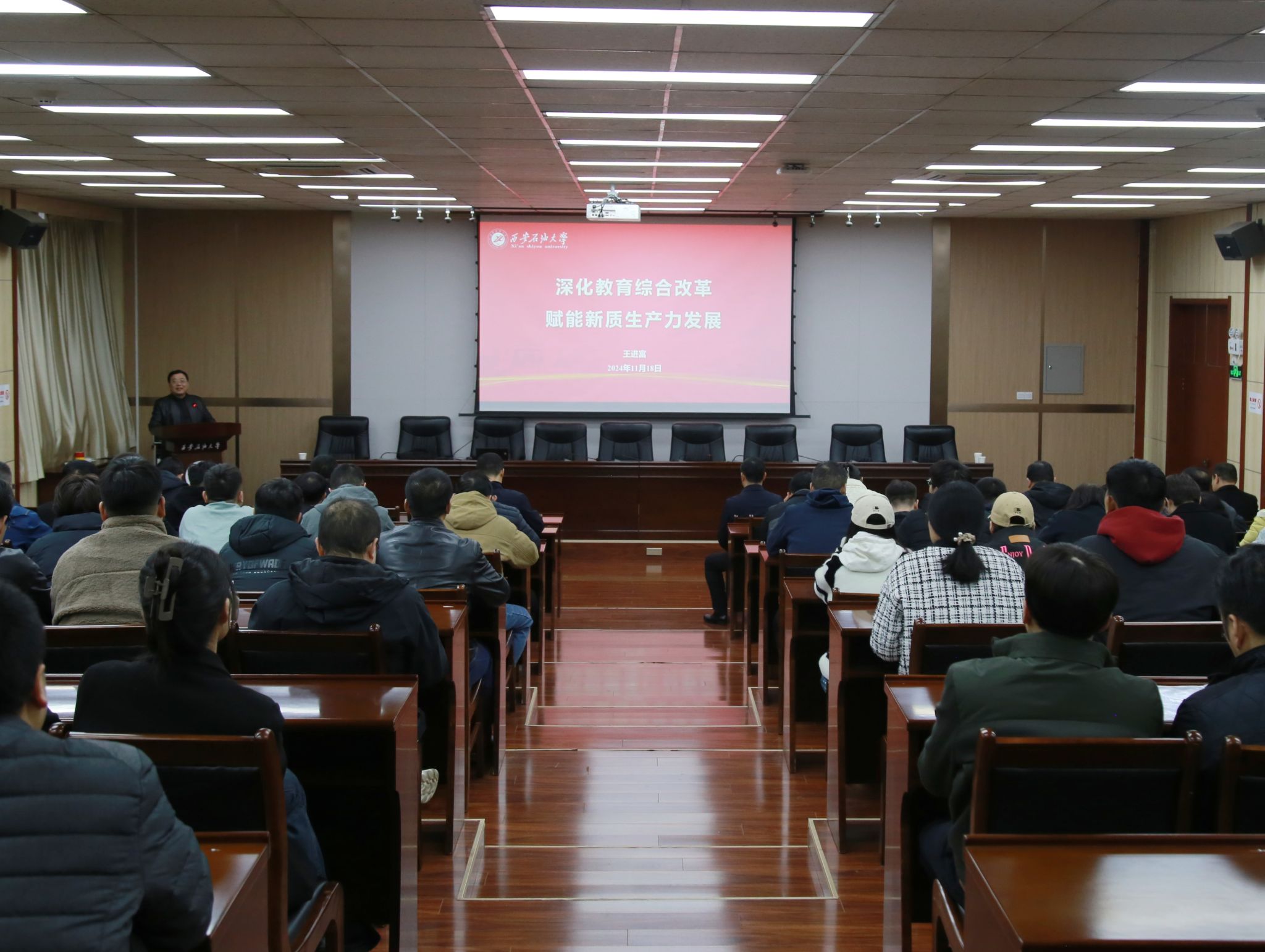 11月18日下午,校長王進富在雁塔校區會議中心第五會議室為地球科學與工程學院領導班子、黨員和全體教職工以及雁塔校區研究生講授了題為“深化教育綜合改革賦能新質生產力發展”的專題黨課和思政課。