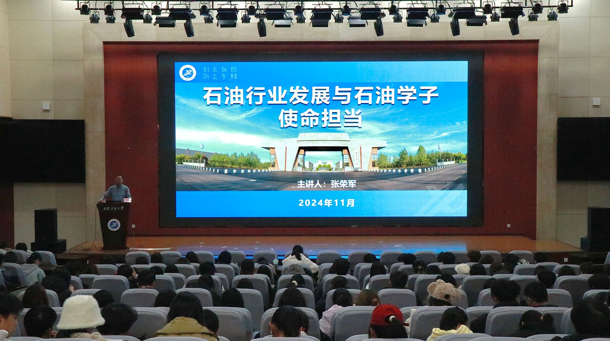 11月25日晚,副校長張榮軍在鄠邑校區弘石報告廳為人文學院學生講授題為“石油行業發展與石油學子使命擔當”的專題思政課,人文學院學生工作干部、2024級全體本科生參加。