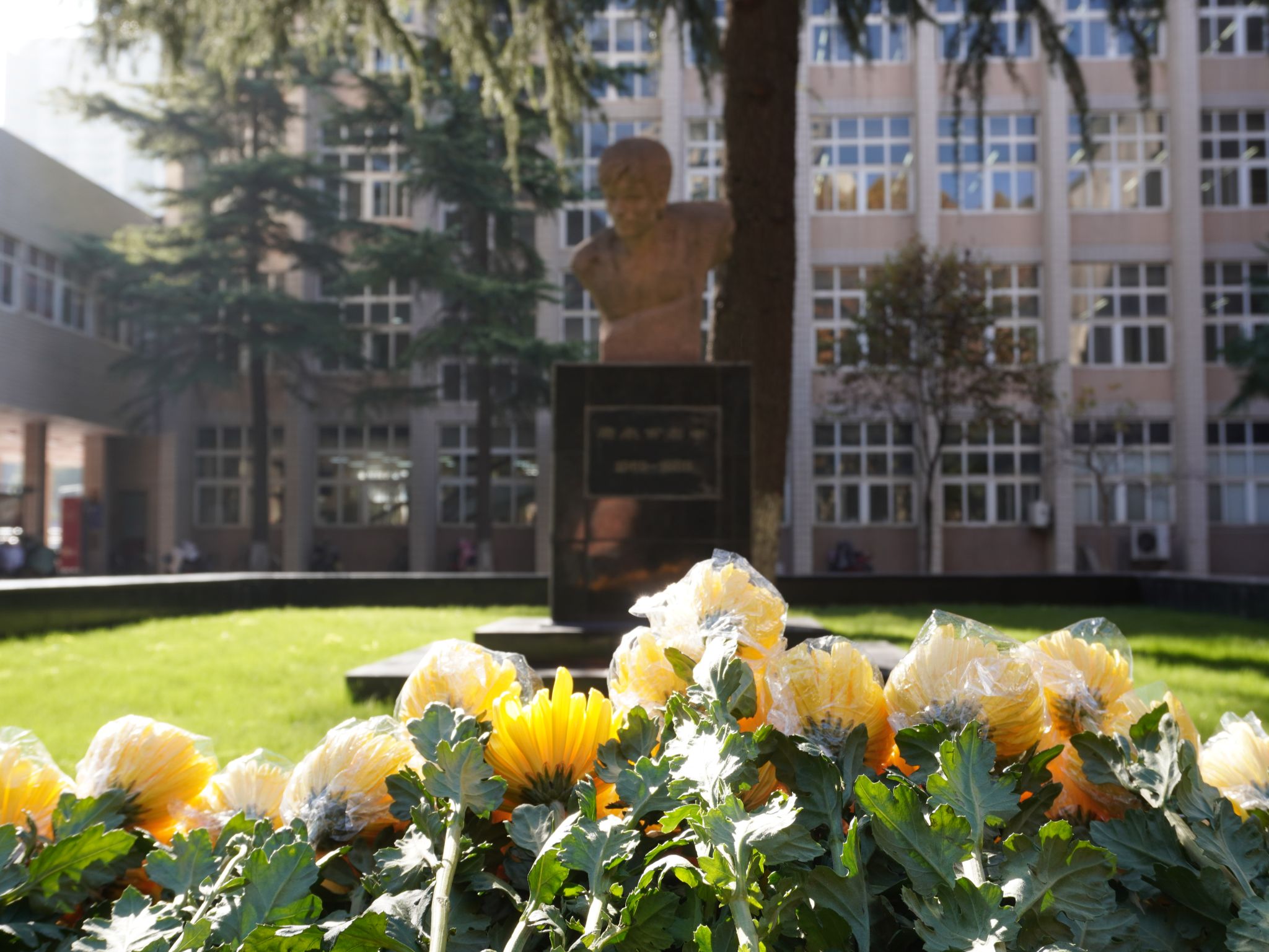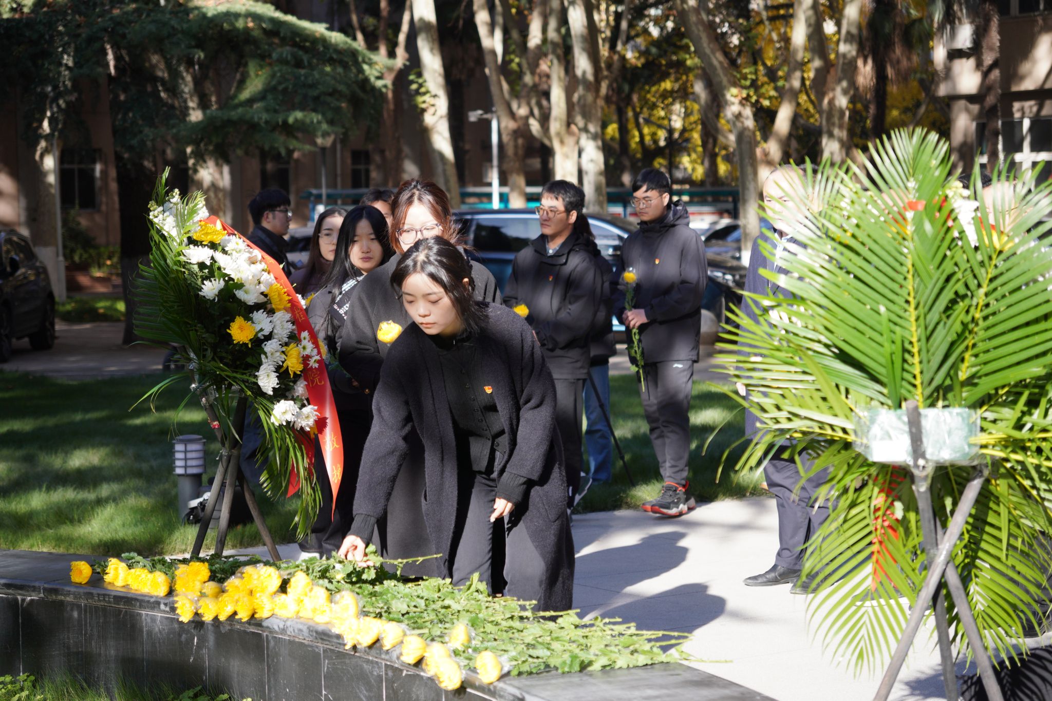 陽光照耀下的唐春雨烈士塑像莊重祥和。全體師生瞻仰唐春雨烈士塑像,默哀一分鐘。常江緩步向前整理了花圈挽聯,隨后全體師生依次向唐春雨烈士敬獻鮮花,鞠躬致敬。