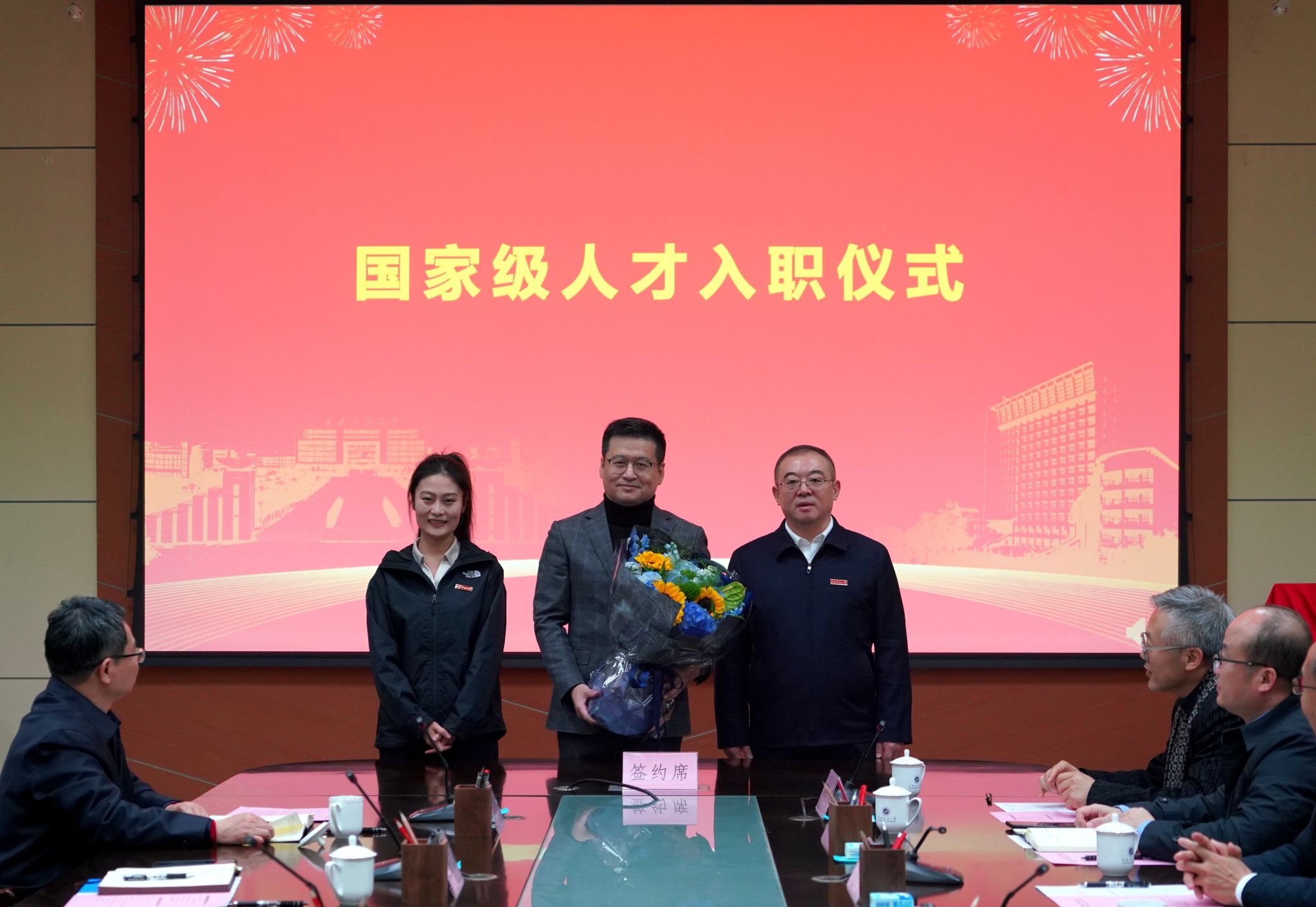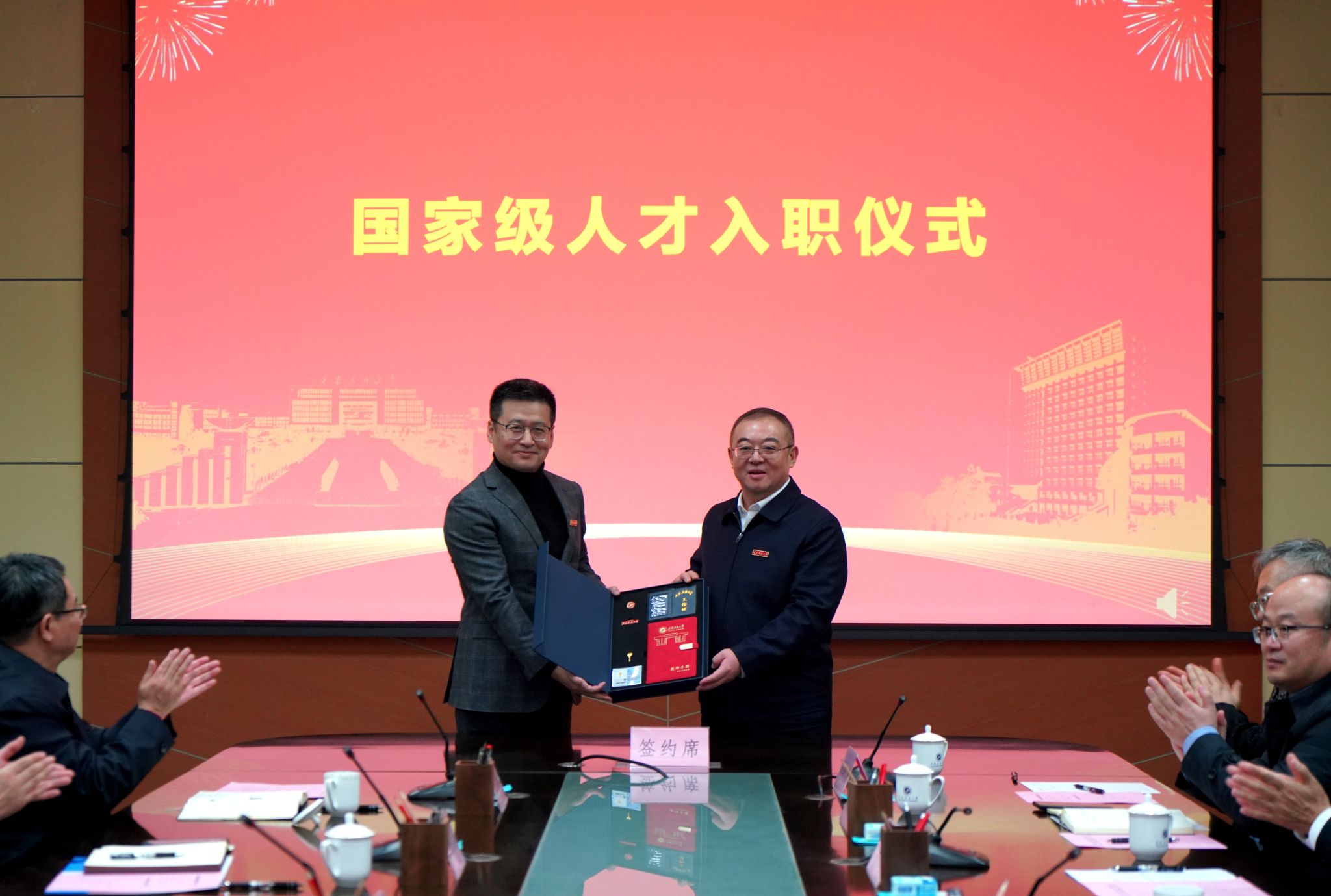 常江為崔仕章教授佩戴校徽并頒發了人才入職專屬禮盒。