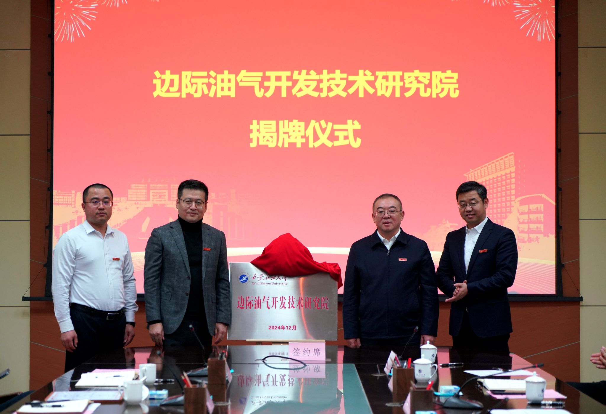 學校黨委書記常江、校長王進富、石油工程學院院長黃海、邊際油氣開發技術研究院崔仕章共同為邊際油氣開發技術研究院揭牌。