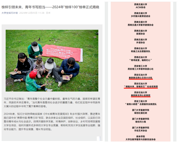 近日,團中央學校部揭曉了2024年“榜樣100”全國優秀大學生團隊及社團榜單,我校秦韻陜北同心文創小分隊、“擁抱未來,禁毒防艾”社會實踐團、秦韻陜北同心實踐團三支團隊入選“榜樣100”全國優秀大學生團隊”。