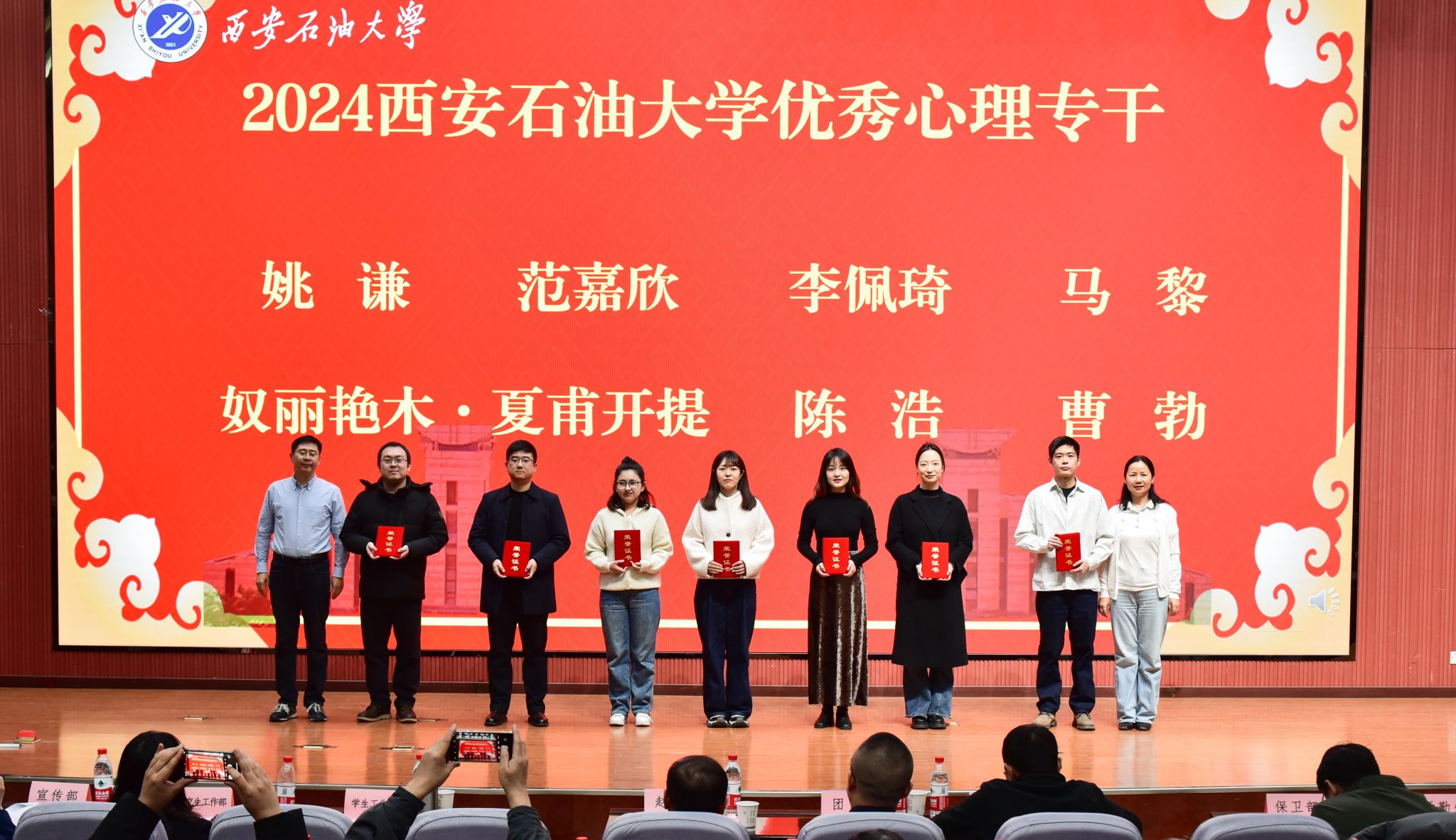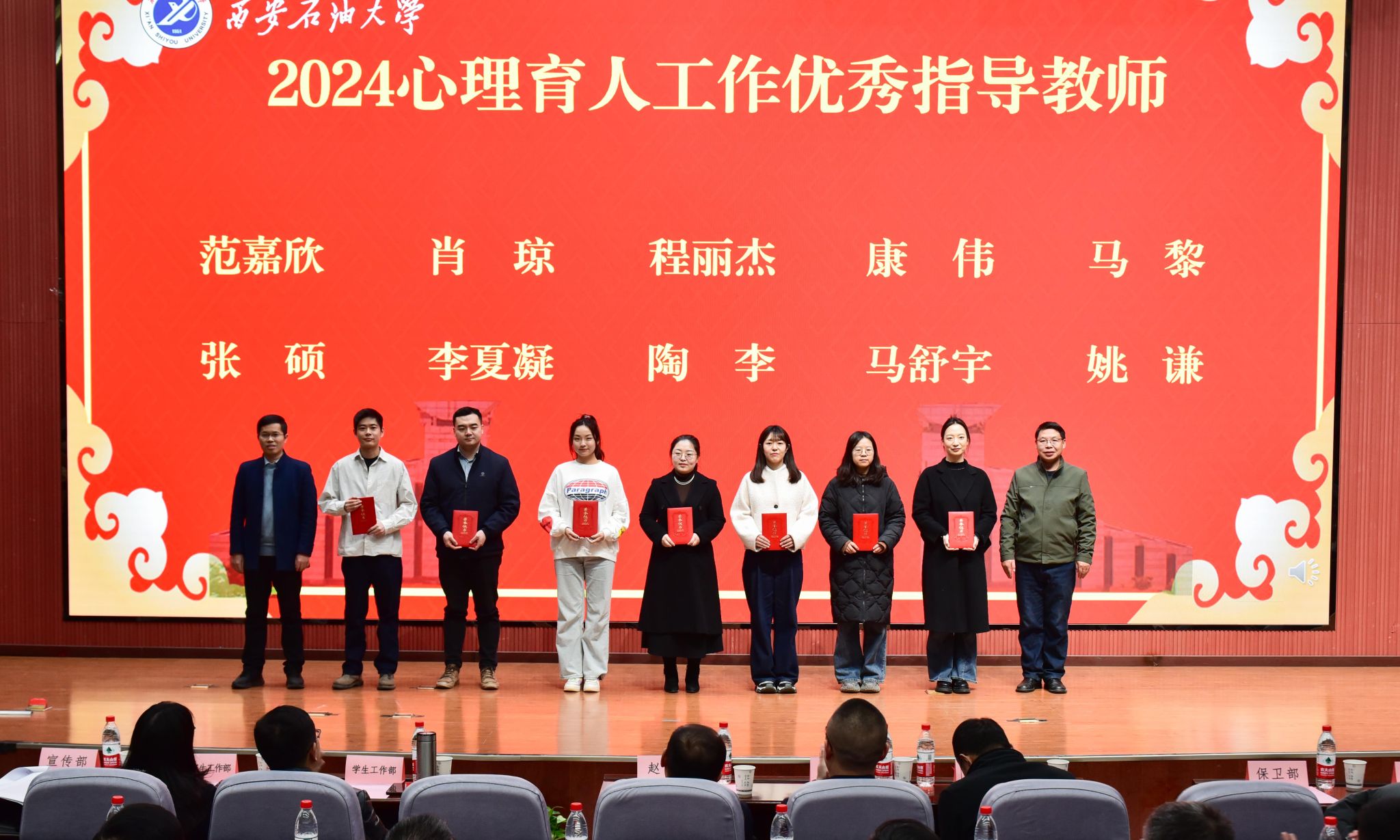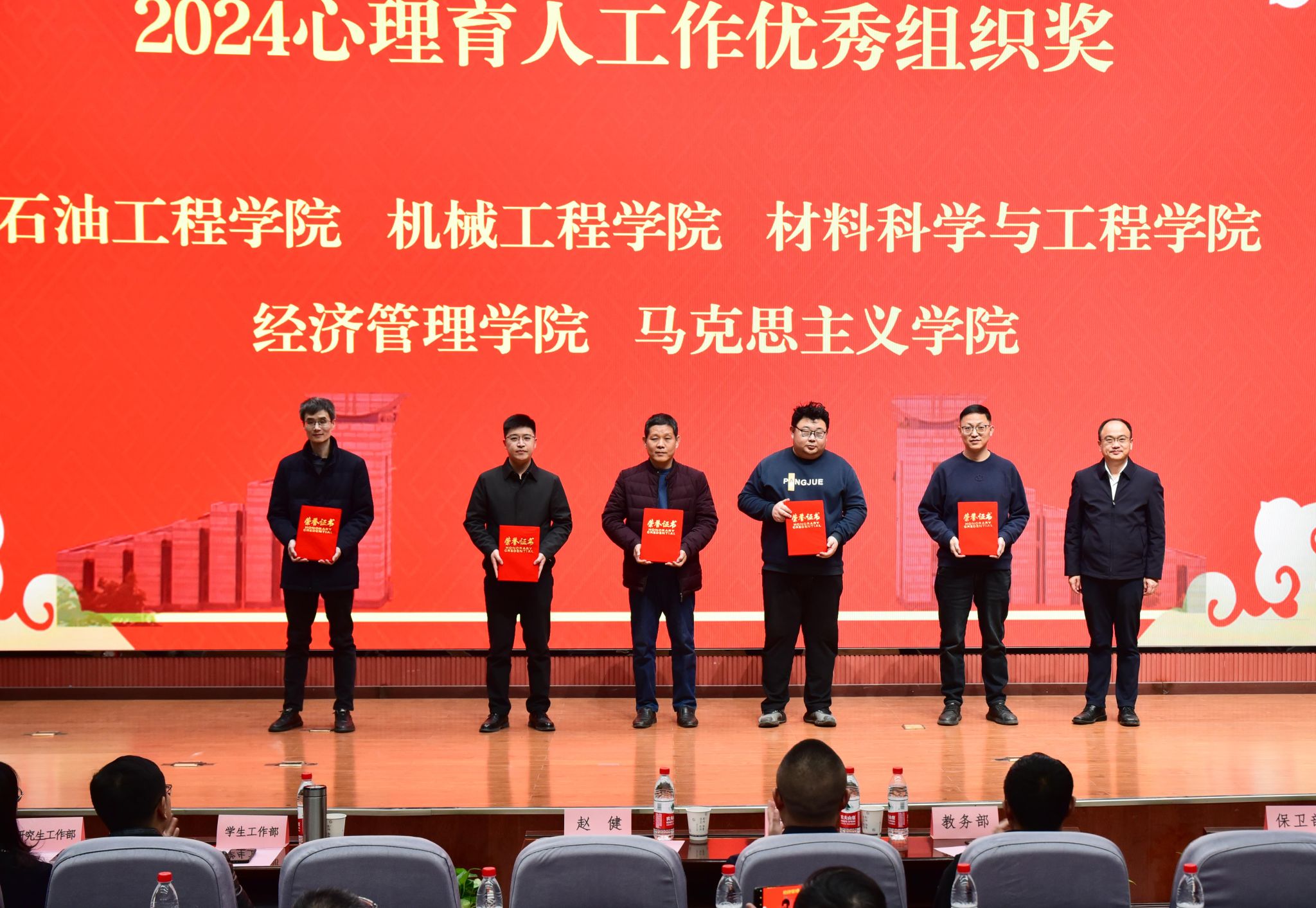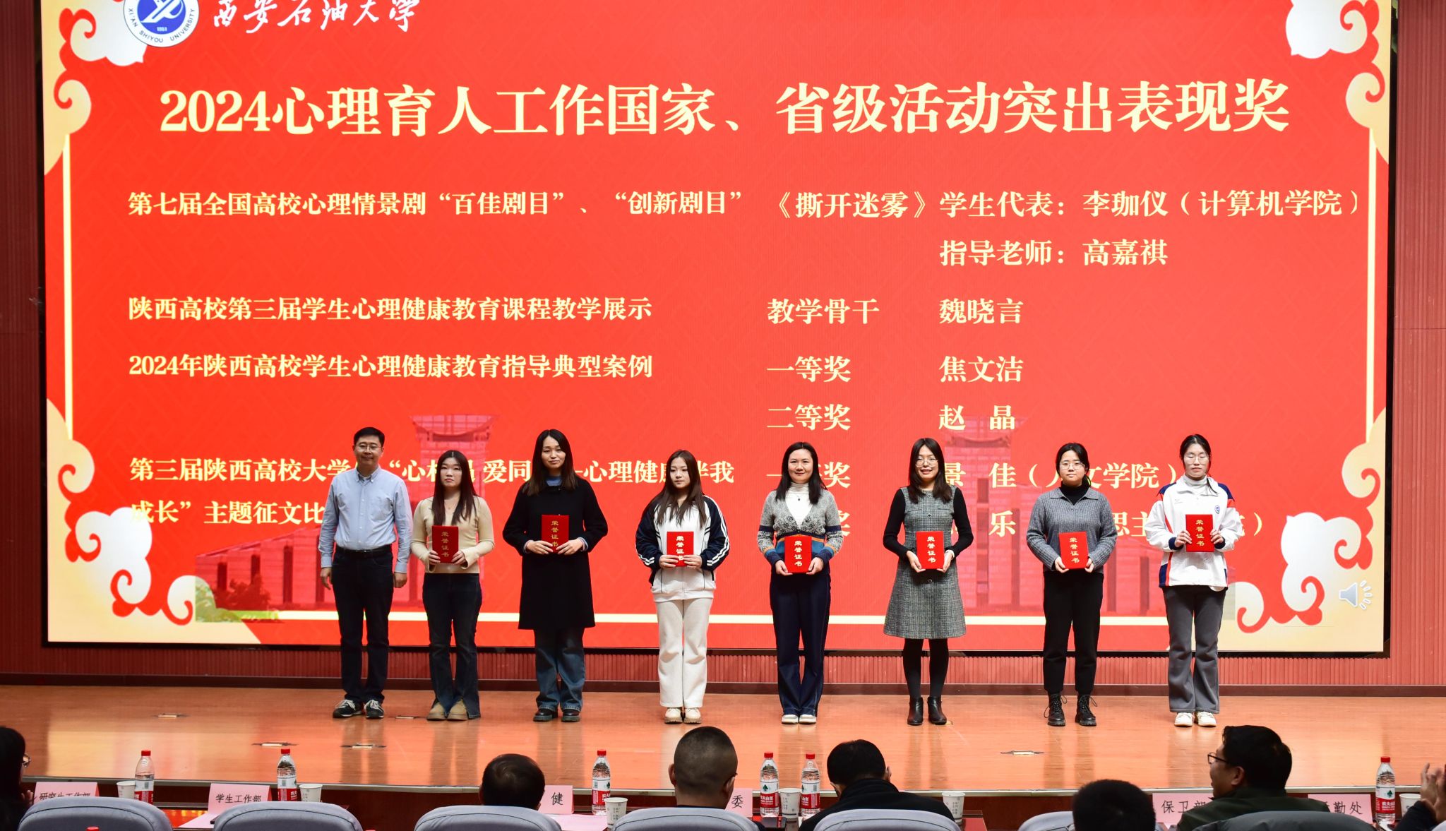 學生工作部部長王亮宣讀了我校師生在2024年國家、省級心理健康教育工作中的獲獎情況以及《關于西安石油大學2024心理育人工作先進單位和個人的表彰決定》。與會領導為獲獎個人及集體頒獎。