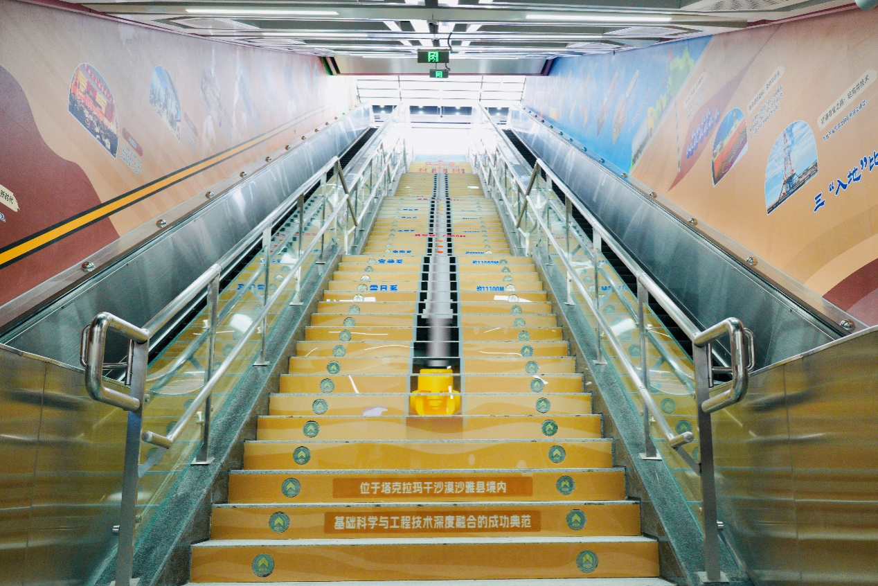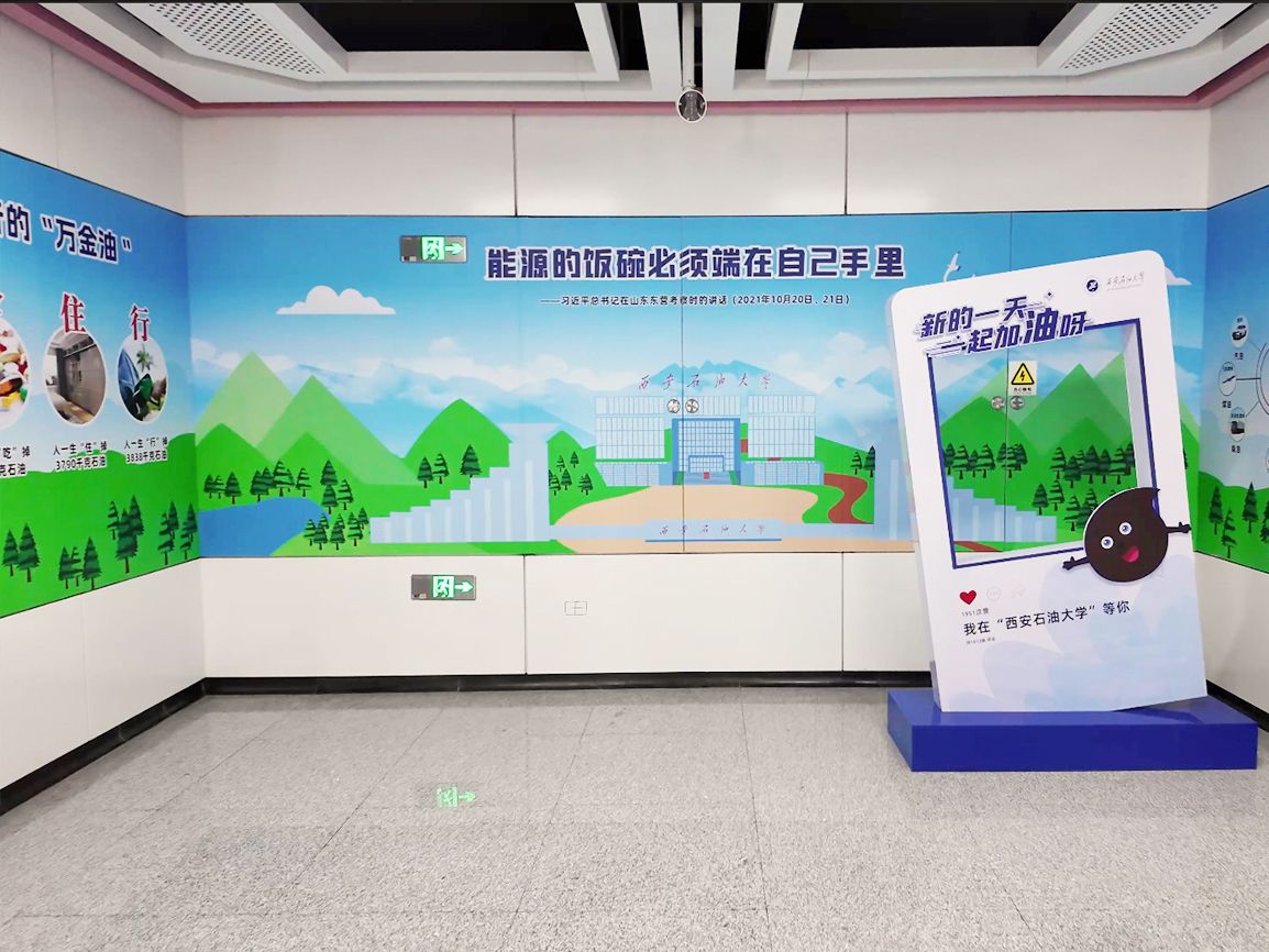 全部布展區域約102米,以模擬地下開采環境為背景,結合進出站行進路線,規劃了“七個場景”的布展內容:1號墻“工業血液——中國石油工業的奮進篇章”,依托進站下行扶梯,再現了石油的最早記錄和中國石油工業從起步到壯大的輝煌歷程,展示了我國在石油技術、裝備、合作等領域的新突破;2號墻“石油七十二變”,依托長廊側面,展示了石油在生產生活中的具體應用場景;3號墻依托出站時映入眼簾的正面墻,展示了習近平總書記關于國家能源安全的重要論述,同時融入我校鄠邑校區經典元素剪影(北大門、圖書館、終南山);4號墻“衣食住行的萬金油”,依托進站下樓時首先映入眼簾的正面墻體,以趣味數字量化人們在生活中使用的石油;在4號墻遠端,強調展出了“為祖國加油、為民族爭氣”和“石油精神辦學 鐵人精神育人 延安精神鑄魂”的理念;5號墻“西石大智慧”是離出站口最近的必經墻體,展示了我校優秀科研成果服務國家重大應用場景;6號墻“油氣產業鏈全景探索”,依托出站上行扶梯墻體,對油氣產業上中下游進行了全階段科普展示;最后,利用出站樓梯的側立面,立體展示了亞洲第一最深直井、我國首口萬米科探井(深地塔科一井)的探地效果和地球的年代地層。