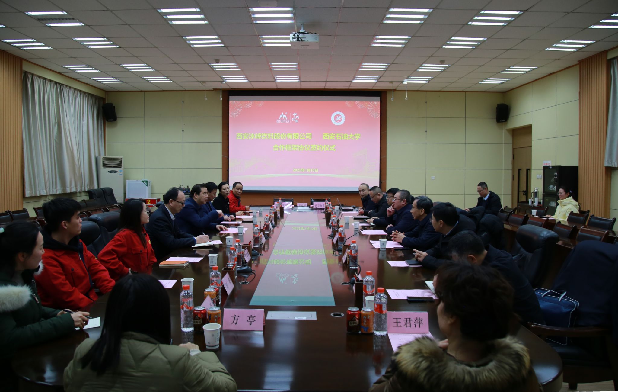 1月15日下午,我校與西安冰峰飲料股份有限公司在雁塔校區簽署了合作框架協議。西安市糖酒集團有限公司黨委書記、董事長、總經理、西安冰峰飲料股份有限公司董事長張軍,西安市糖酒集團有限公司黨委委員、西安冰峰飲料股份有限公司總經理姚軍鋒,西安市糖酒集團有限公司黨委委員、西安酒廠有限公司總經理賀軍強,西安冰峰飲料股份有限公司黨支部副書記段莉娜,我校黨委書記常江,黨委委員、副校長張驍勇出席簽約儀式。儀式由校黨委副書記張木主持。