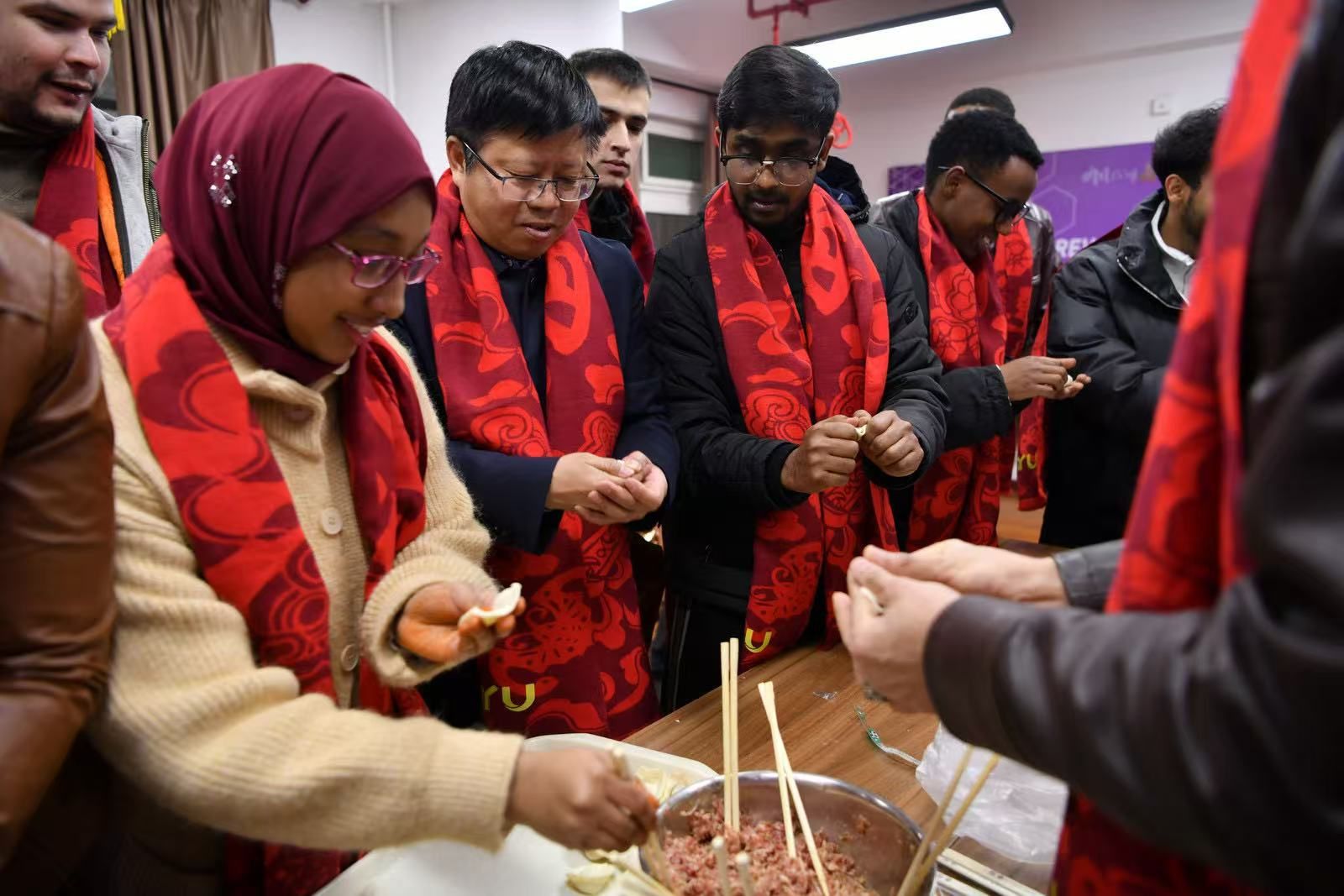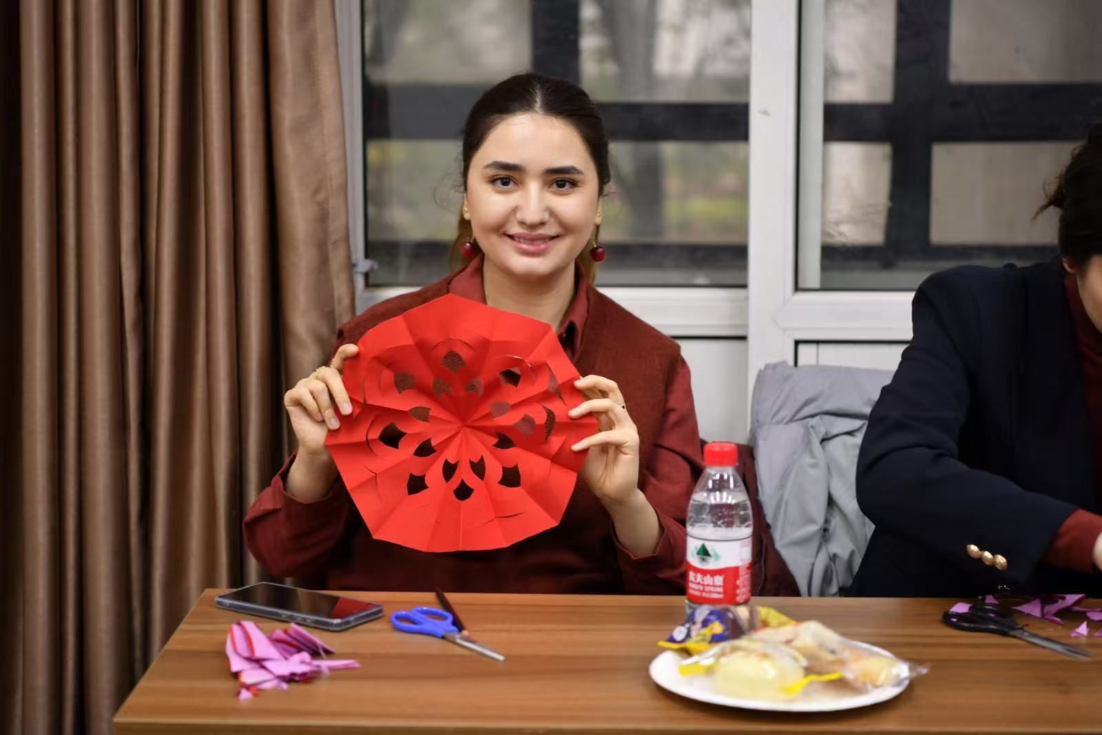 慰問期間,張驍勇與國際學生們一道實踐,親自示范包餃子的方法和蛇形剪紙技巧。大家圍坐在一起,歡聲笑語不斷,共同慶祝農歷新年的到來。
