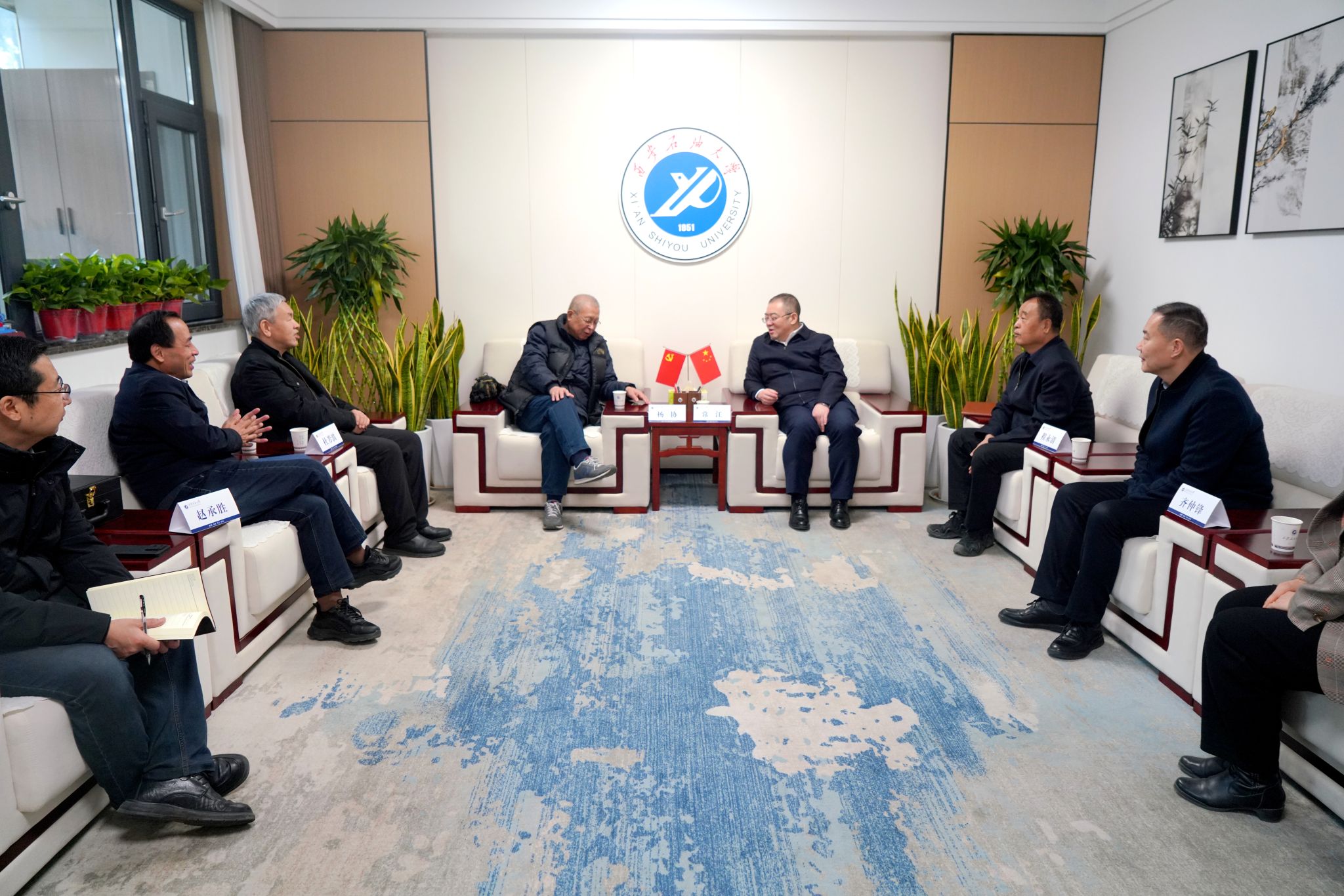 3月5日上午,校黨委書記常江在雁塔校區行政樓會客廳會見了西北石油工業學校創建者楊拯民之子、陜西省杜斌丞教育思想研究會名譽會長楊協,革命教育家杜斌丞后人、陜西省杜斌丞教育思想研究會會長杜芳濱,并就挖掘校史資源、加強校園文化建設、構建特色育人體系等相關工作展開研討。校黨委副書記程永清參加會見。