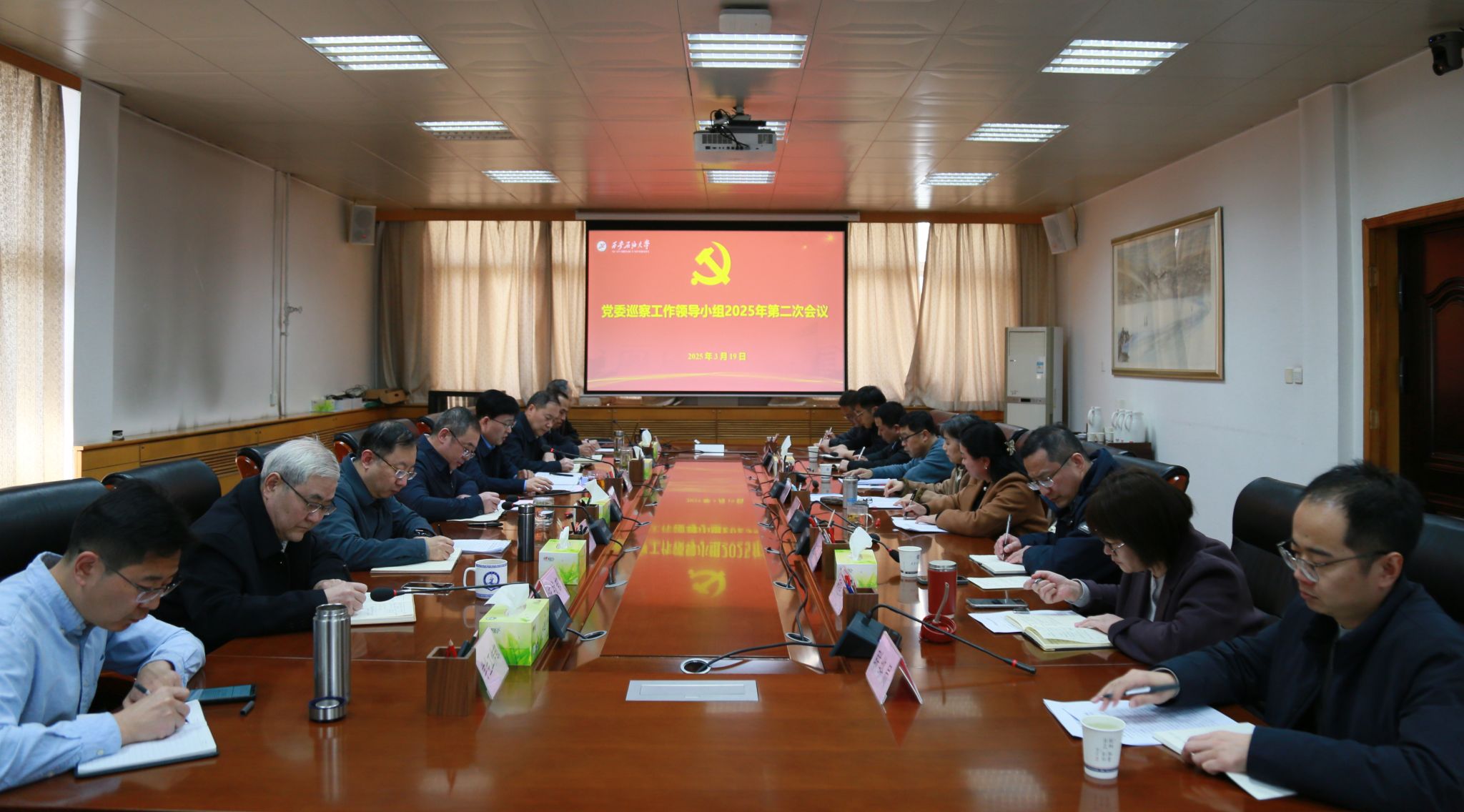 3 月19日下午,學校在雁塔校區辦公樓五樓會議室召開黨委巡察工作領導小組2025 年第二次會議,審議第三屆黨委第一輪巡察情況報告。校黨委書記、黨委巡察工作領導小組組長常江出席會議并講話。校黨委巡察工作領導小組成員單位和黨委統戰部、黨委學生工作部、黨委保衛部、研究生工作部主要負責人參加會議。會議由校黨委副書記、紀委書記、監察專員、黨委巡察工作領導小組副組長王輝強主持。
