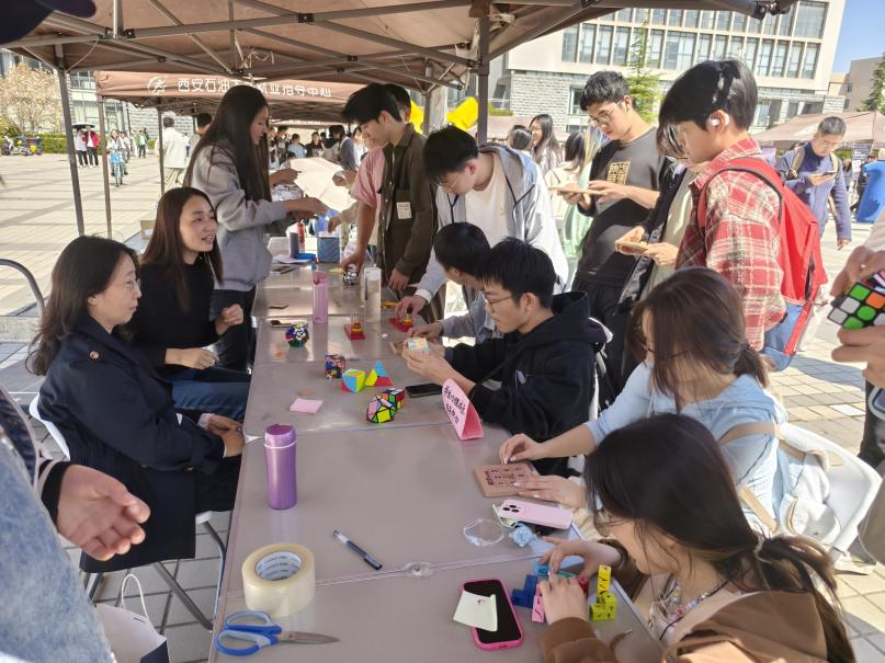 “以美潤心”展臺上,校團委的“小狗集市”充滿溫馨,同學們寫下心里話、煩惱、愿望或祝福,制作并領養紙小狗獲得陪伴;“情緒面具DIY-探索內心的真實”,引導同學們思考情緒表達的內外差異,在創作和分享中釋放情感,增強自我認知和同理心。電子工程學院的“封藏心事,讓星星承載煩惱”,機械工程學院的“喜悅律動,情緒調色盤”,材料科學與工程學院的“心懷美好,向光而行”,人文學院的“請和我擊掌吧”以及心理委員聯合協會和大學生心理協會組織的“表情解語”“心動訊息”“繪影寄情”等活動,也從不同角度引導同學們關注內心世界,用藝術和創意表達情感,傳遞積極的生活態度。