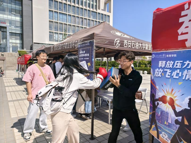 “以體強心”展臺上,體育學院的“釋放壓力、放飛心情”,通過擊打拳靶,促進全身血液循環,刺激多巴胺分泌,幫助同學們釋放壓力。